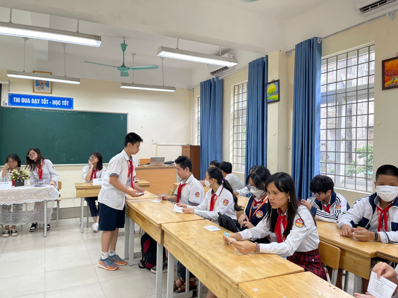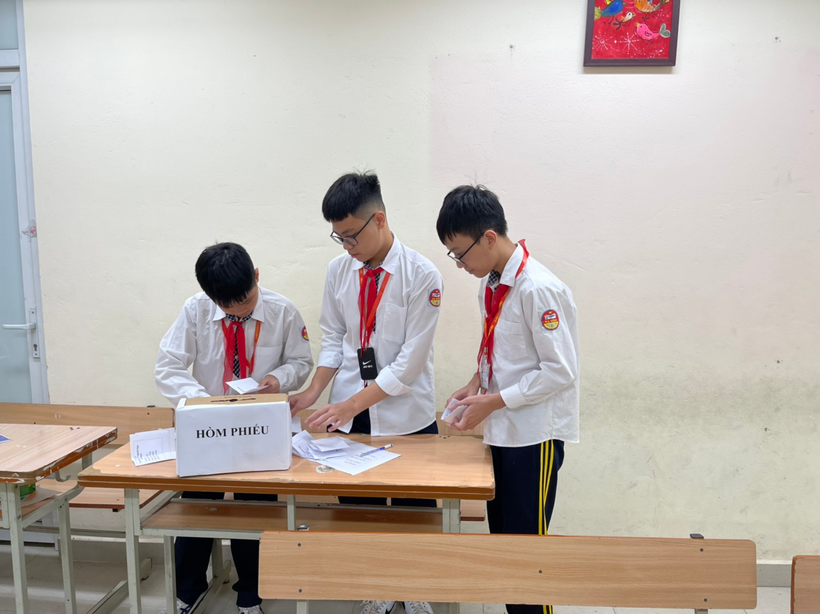 Đại diện học sinh đi phát phiếu bầu cử, các bạn học sinh bỏ phiếu vào hòm phiếu