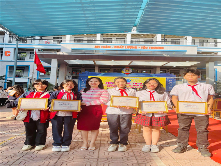 chụp ảnh cùng các học sinh đạt giải Nhất, Nhì của lớp trong lễ Tổng kết