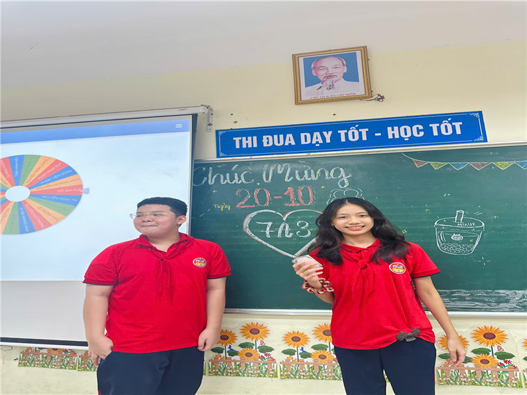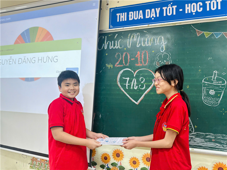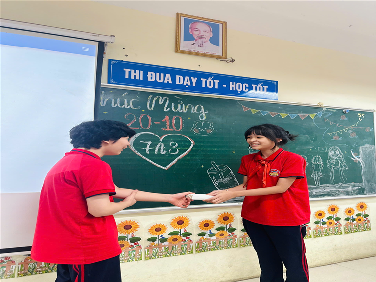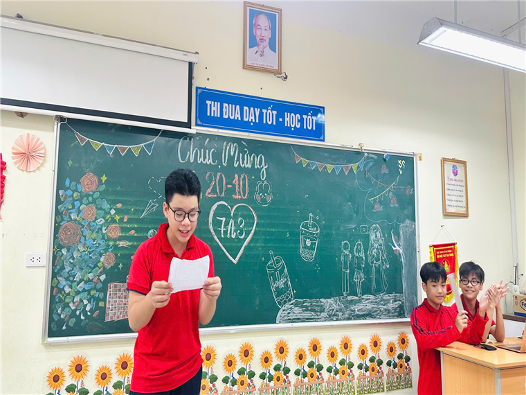 Nhân dịp chào mừng Ngày Phụ nữ Việt Nam 20/10 và với mong muốn mang lại những kỷ niệm đáng nhớ, vui vẻ và tràn đầy ý nghĩa, các bạn trong lớp 7A3 chúng con đã cùng nhau trang trí bảng chào mừng ngày 20/10, sắp xếp lại những chỗ ngồi, quét rác để lớp sạch sẽ, chuẩn bị cho những tiết mục đặc sắc trong ngày đặc biệt này. Sau những giây phút cùng nhau dọn dẹp và trang trí lớp, tập thể 7A3 cùng hướng lên trên bục giảng, lắng nghe những lời chúc từ bạn nam gửi gắm đến một nửa của thế giới. Đại diện phái mạnh trong lớp là hai bạn Xuân Hải và Tiến Dũng đã lên gửi những lời chúc tới các bà, các mẹ, cô giáo và các bạn nữ với những lời chúc sức khoẻ, luôn vui tươi và hạnh phúc. Không chỉ thế, các bạn nam còn tếu táo khi gửi gắm tới các bạn nữ trong lớp: “Chúc các bạn nữ trong lớp 7A3 luôn xinh đẹp, học thật giỏi và bớt hung dữ, không sai vặt các bạn nam trong lớp nữa nhé.”