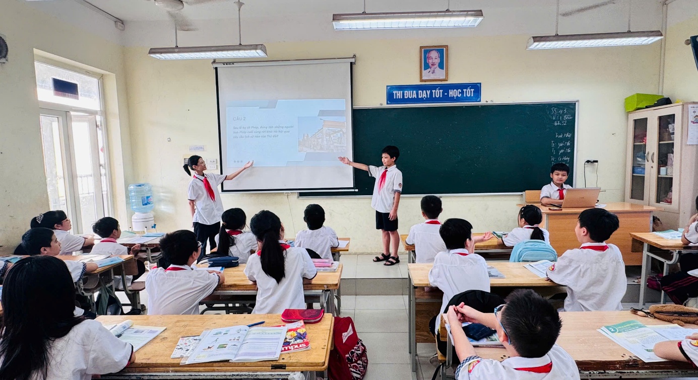 Phần sôi nổi nhất của tiết học là trò chơi “Đố vui cùng lịch sử Thủ đô”, do các bạn Lan Nhi và Minh Quân dẫn chương trình, Lâm Phong phụ trách máy chiếu và Bảo Châu làm thư ký. Những câu hỏi thú vị về lịch sử được trình chiếu trên màn hình khiến cả lớp hào hứng giơ tay trả lời. Tiếng cười, tiếng vỗ tay, và những phần quà nhỏ đã tạo nên một bầu không khí vừa học vừa chơi thật vui tươi, bổ ích.