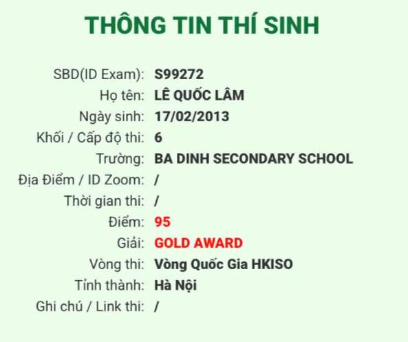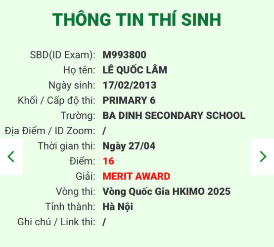 Không chỉ vậy, bạn còn đạt thành tích cao trong Kỳ thi Olympic Toán học quốc tế HKIMO (HongKong International Mathematical Olympiad) được tổ chức bởi Trung tâm Giáo dục Vô địch Olympic Hồng Kông, khẳng định tài năng nổi bật của mình ở lĩnh vực Toán học của mình.
