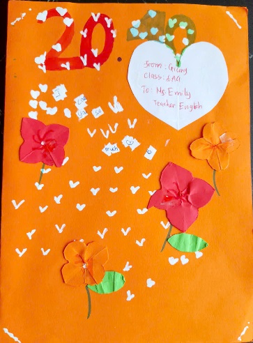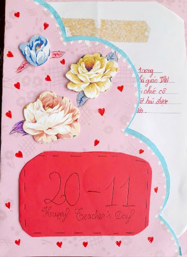 Mỗi tấm thiệp của 9A6 đều mang phong cách riêng biệt nhưng chung một điểm: tình cảm chân thành. Có tấm được vẽ hình cây bút và quyển sách - biểu tượng của nghề giáo. Có tấm lại trang trí bằng hình ảnh những bông hoa tươi thắm, tượng trưng cho lòng biết ơn và kính trọng. Phía bên trong, những lời chúc mộc mạc nhưng ấm áp được viết nắn nót.