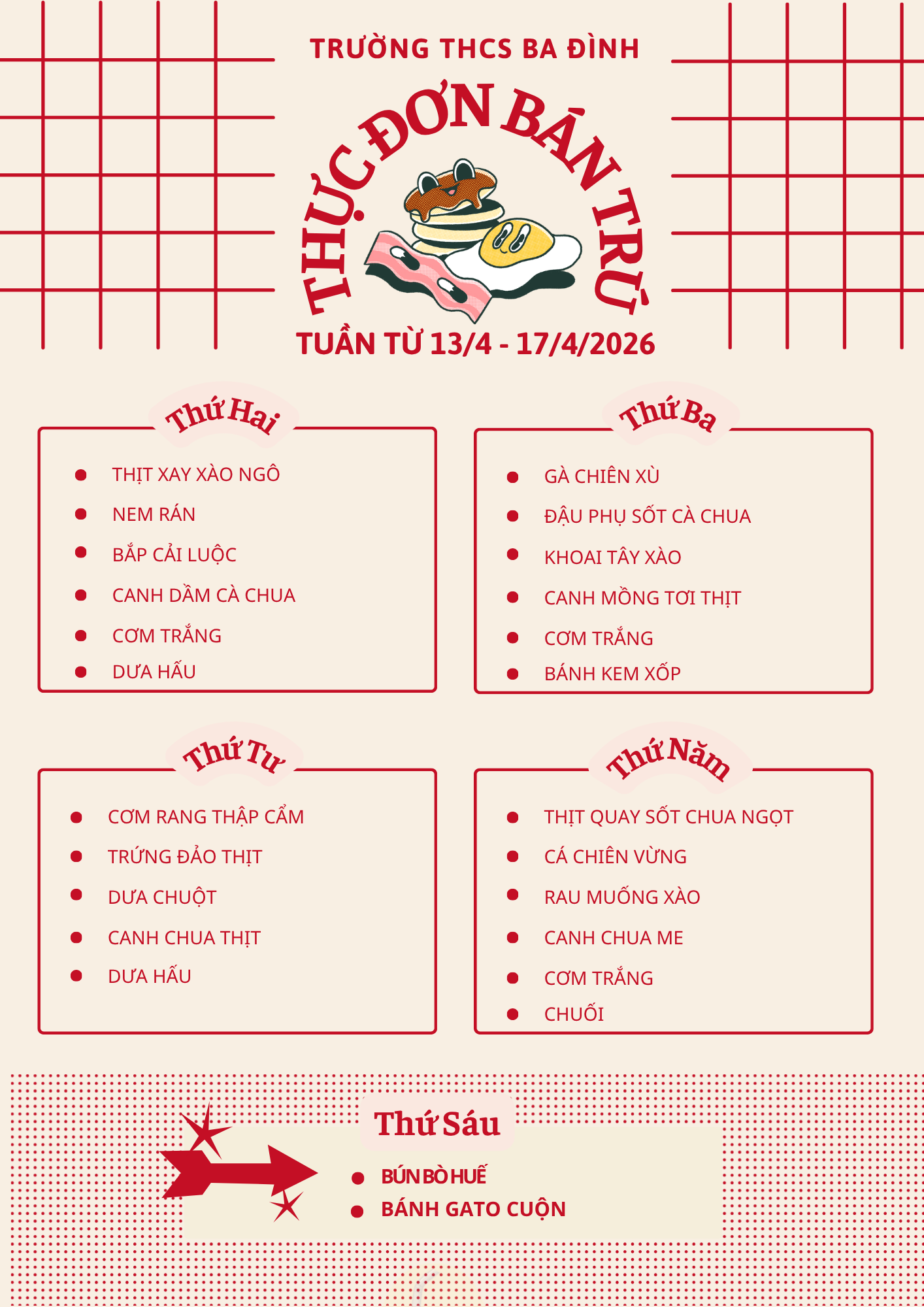 Thực đơn bán trú tuần từ 13/4 đến hết ngày 17/4/2026
