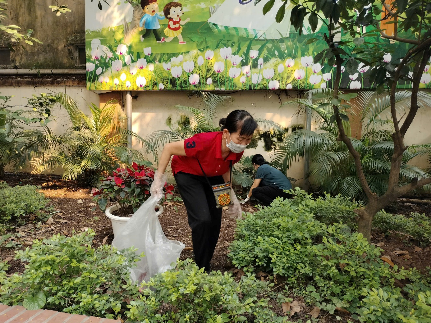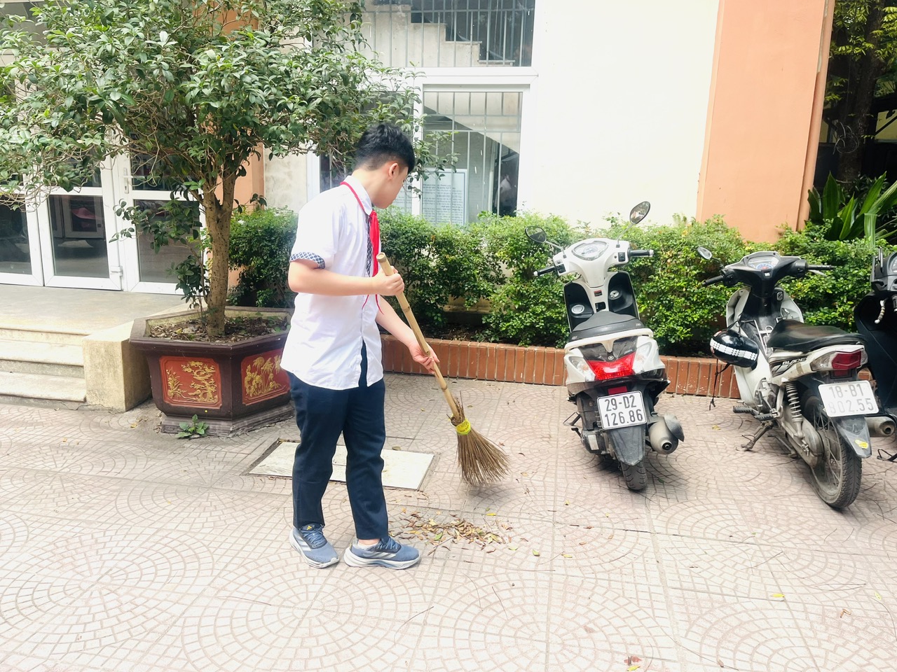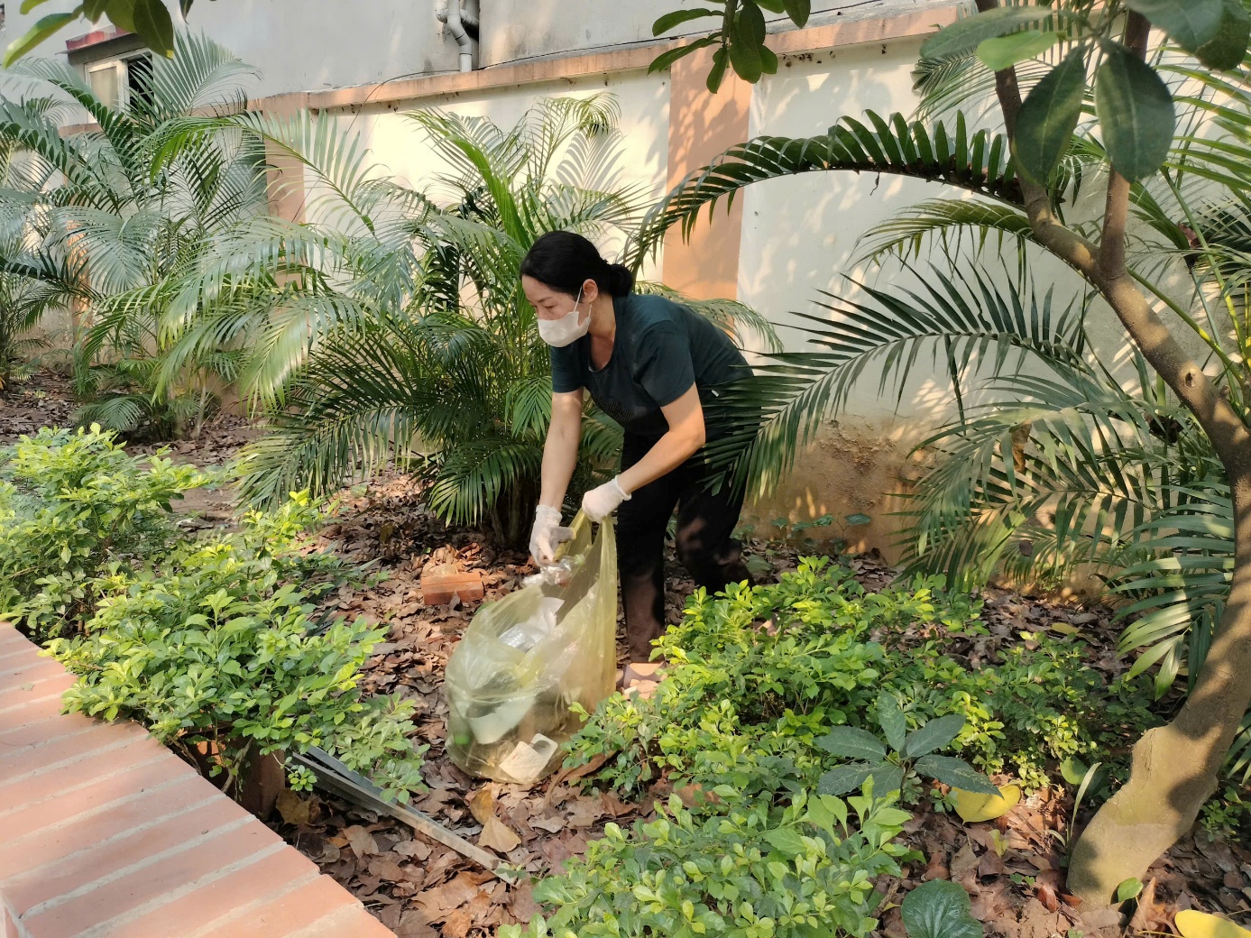 Nhân viên lao công tiến hành vệ sinh các khu vực xung quanh trường và thu gom rác thải