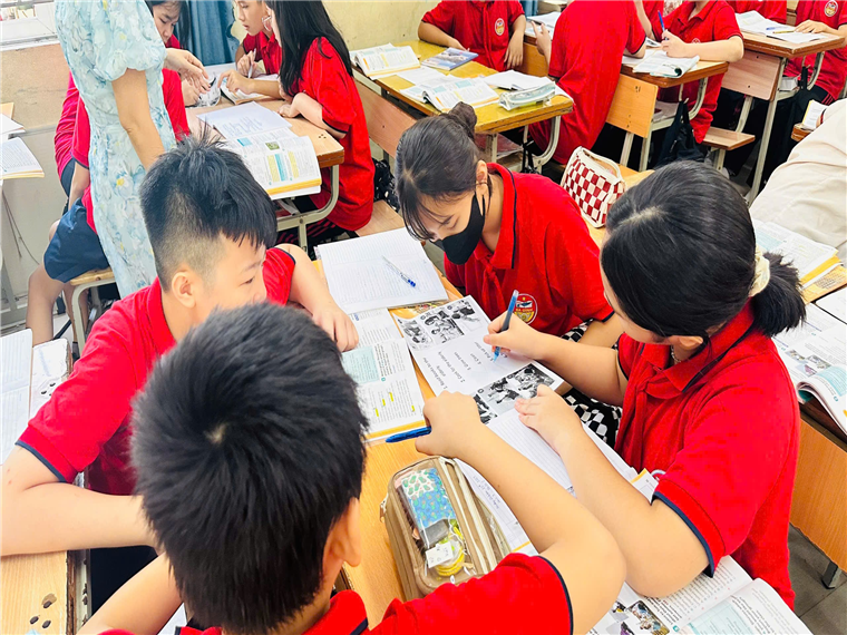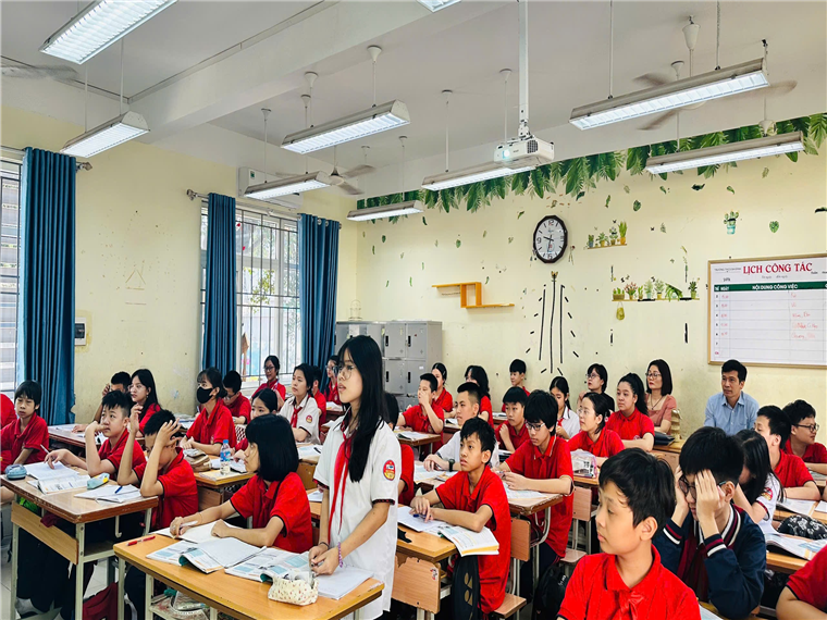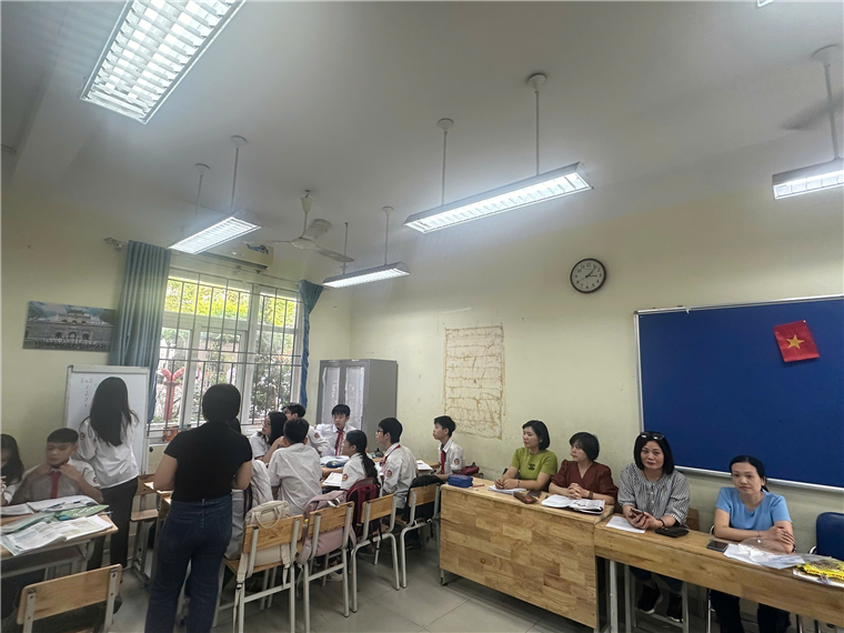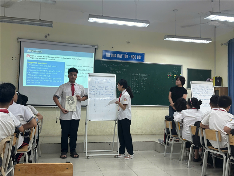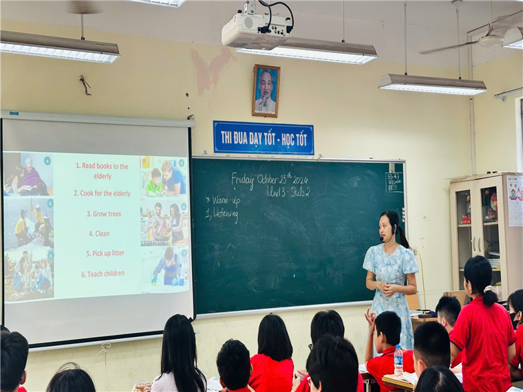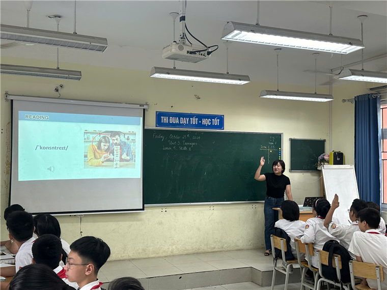 Trong buổi hội giảng tiếp theo của tổ Ngoại ngữ, cô giáo Nguyễn Bích Thuỷ, với chất giọng nhẹ nhàng và phát âm tiếng Anh chuẩn, đã rất thành công với phương pháp dạy từ vựng trong phần Warm-up tiết dạy Skills 1 của Unit 3: Teenagers. Các em học sinh được cô hướng dẫn kỹ cách luyến âm, cách đọc âm để giúp các con đọc chính xác hơn. Với việc giúp học sinh học kỹ các từ vựng này, cô giáo Bích Thuỷ đã giúp các con chủ động trong quá trình làm các bài tập liên quan đến kỹ năng Reading, một trong kỹ năng được đánh giá là quan trọng trong đề thi format mới năm 2025. Không chỉ thế, thông qua các cấu trúc được cô Thuỷ nhấn mạnh trong bài đọc, các con còn được tham gia vào các hoạt động Speaking thực hiện xuyên suốt.