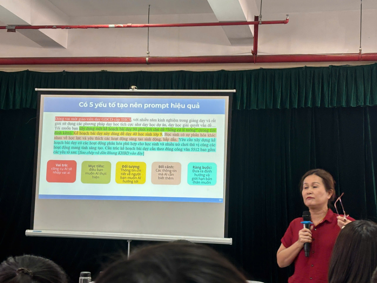 Tại hội nghị, các giáo viên cốt cán đại diện các nhà trường đã được tập huấn về nội dung “ Ứng dụng trí tuệ nhân tạo (AI) trong dạy học và kiểm tra đánh giá môn GDCD”