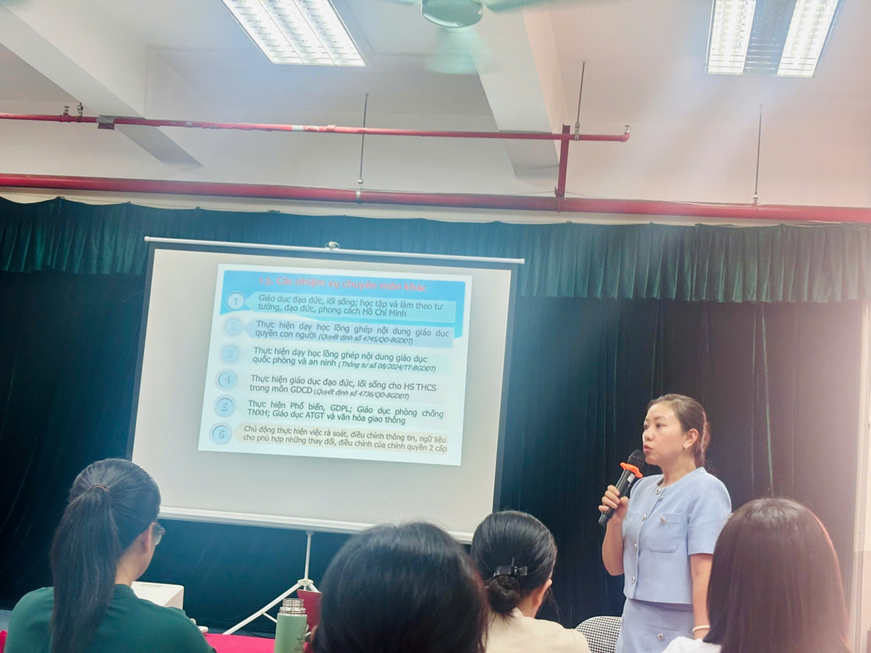 Tiếp đó, đại diện Sở GD&ĐT Hà Nội, chuyên viên phụ trách môn GDCD cũng đã triển khai nhiệm vụ năm học 2025 - 2026, các hoạt động chuyên môn về xây dựng KHDH, các nội dung, chủ đề cần lồng ghép trong dạy học môn GDCD ở THCS theo các thông tư, quyết định của Bộ GD&ĐT như nội dung giáo dục quyền con người, giáo dục quốc phòng và an ninh, Phổ biến, GDPL; Giáo dục phòng chống TNXH; Giáo dục ATGT và văn hóa giao thông …