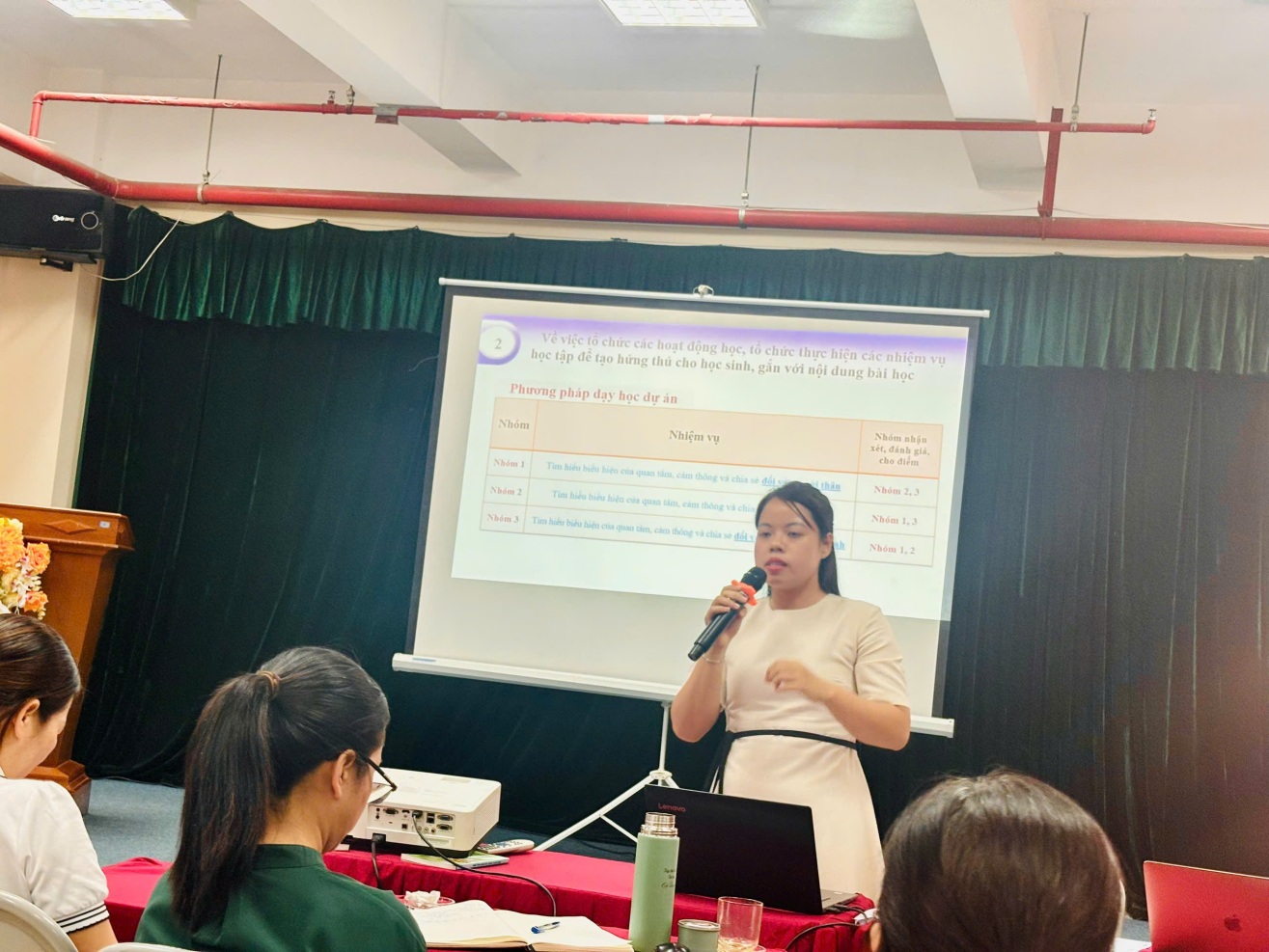 Hội nghị cũng nghe những chia sẻ của 2 giáo viên trẻ về kinh nghiệm trong thiết kế các hoạt động dạy học cho tiết dự thi GVG cấp thành phố trong những năm học trước. Điểm nổi bật ở các tiết dạy của 2 cô giáo là cách thức tổ chức các HĐ cho học sinh rất gần gũi,đơn giản, thực tế và phát huy được năng lực, tính sáng tạo, chủ động và hợp tác của học sinh.