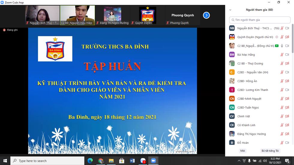 Hiện nay, trong bối cảnh dịch bệnh Covid-19, giáo viên và học sinh phải tham gia dạy và học trực tuyến, vai trò của công nghệ thông tin được đẩy mạnh, đặc biệt trong việc trình bày các loại văn bản và việc kiểm tra đánh giá học sinh trực tuyến. Hiểu rõ điều đó, ngày 18/12/2021, 100 % cán bộ, giáo viên trường THCS Ba Đình đã được tập huấn về vấn đề Kỹ thuật trình bày văn bản và kỹ thuật ra đề kiểm tra dưới sự dẫn dắt của thầy Phó Hiệu trưởng Nguyễn Hữu Hiệp.