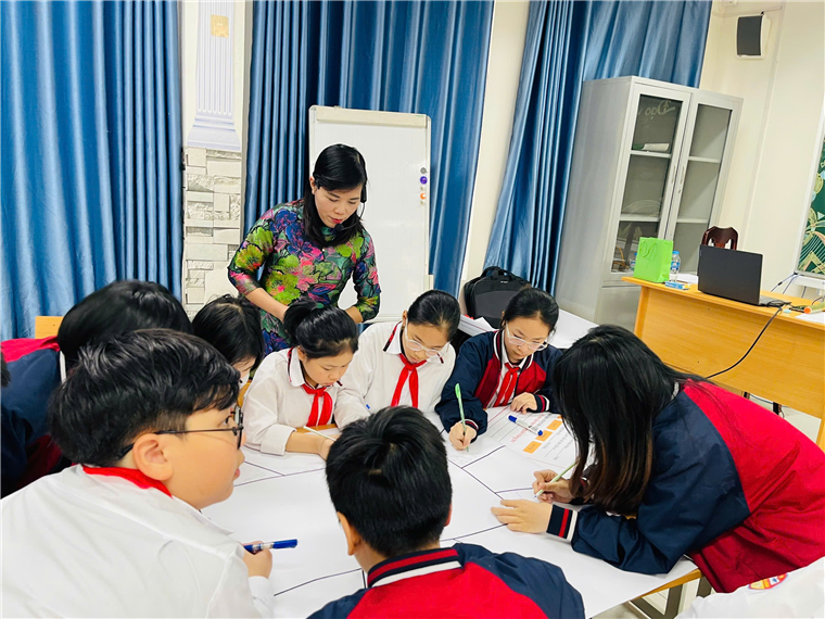 Cô giáo Bích Hường hướng dẫn học sinh thực hiện kỹ thuật khăn trải bàn