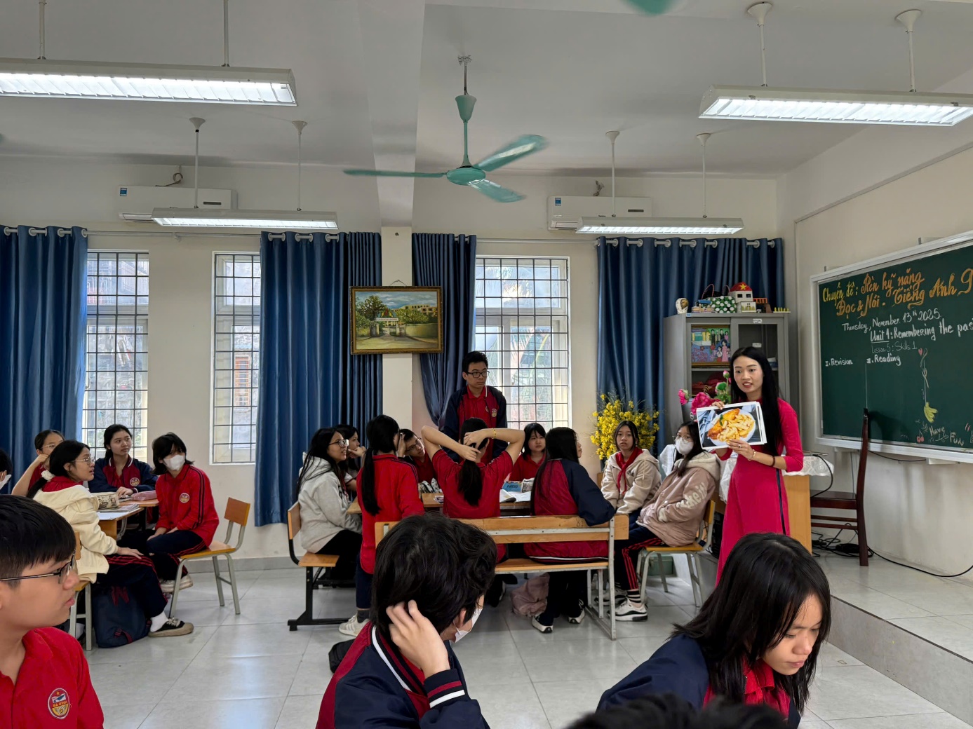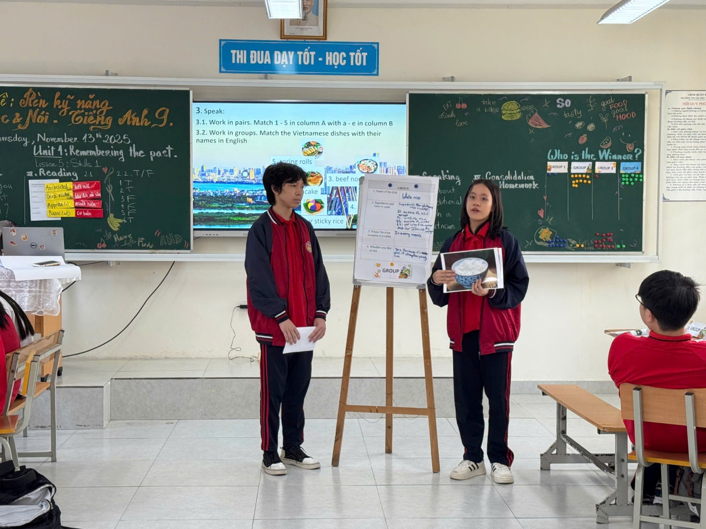 Điểm nhấn nổi bật của tiết học nằm ở phần kĩ năng nói. Học sinh được chuẩn bị và thuyết trình về món ăn yêu thích của mình, sử dụng các cấu trúc miêu tả, trình bày lí do lựa chọn và cách chế biến. Nhiều bài thuyết trình sáng tạo, tự tin, mang màu sắc cá nhân đã tạo không khí hào hứng trong lớp học. Hoạt động phản hồi từ bạn bè và giáo viên giúp các em nâng cao khả năng giao tiếp, diễn đạt và tương tác bằng tiếng Anh.