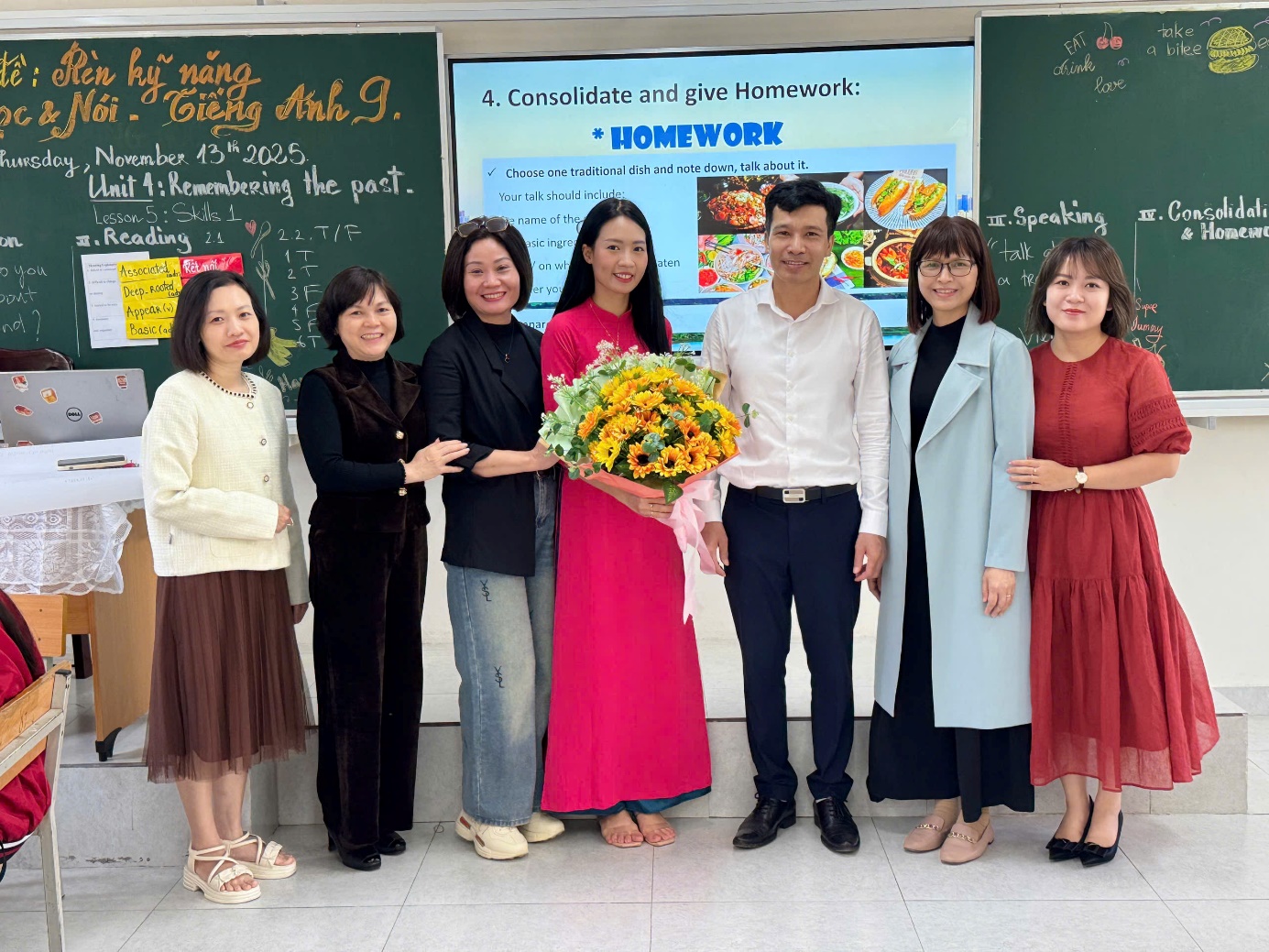 Ban giám hiệu và tổ chuyên môn tặng hoa chúc mừng cô giáo Nguyễn Mai Chi đã hoàn thành chuyên đề