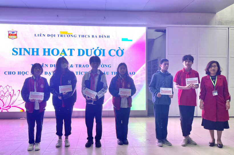 Trong buổi Sinh hoạt dưới cờ, nhà trường đã tuyên dương và trao phần thưởng cho những học sinh có thành tích trong các cuộc thi thể dục thể thao cấp quận và cấp thành phố. Chúc mừng các em học sinh đạt giải môn Cầu lông cấp quận: em Nguyễn Thu Hà - lớp 6A4 và em Vũ Phạm Trang Linh - lớp 7A6 đạt Huy chương Vàng; em Ninh Tuấn Đạt - lớp 7A3, em Vũ Hữu Minh Đức - lớp 7A8 và em Trương Anh Đức - lớp 6A2 đạt Huy chương Đồng. Ngoài ra, em Hồ Minh Anh - lớp 8A2 đã đạt thành tích xuất sắc với 02 Huy chương Vàng cấp quận và 02 Huy chương Vàng cấp thành phố môn Bơi lội.