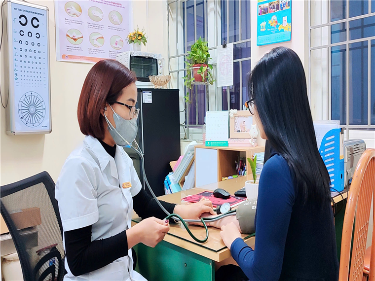 Cô Đoàn Thị Thảo (bên trái) đo huyết áp cho giáo viên nhà trường