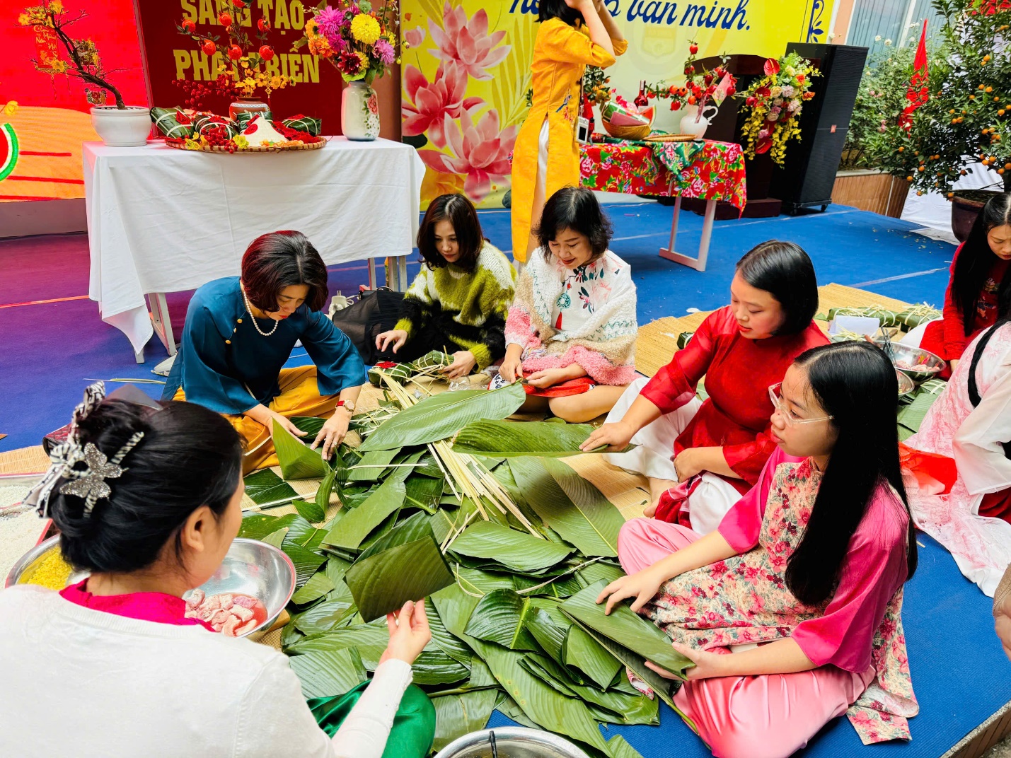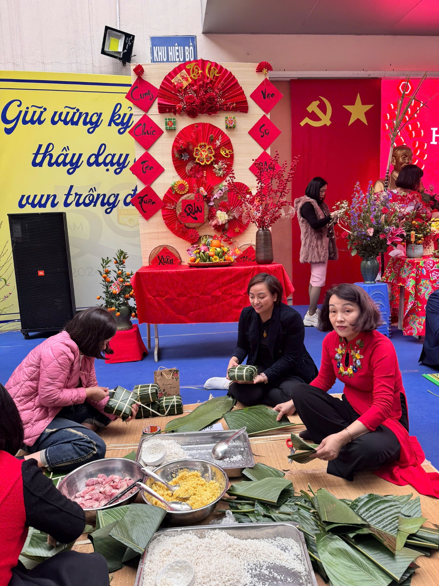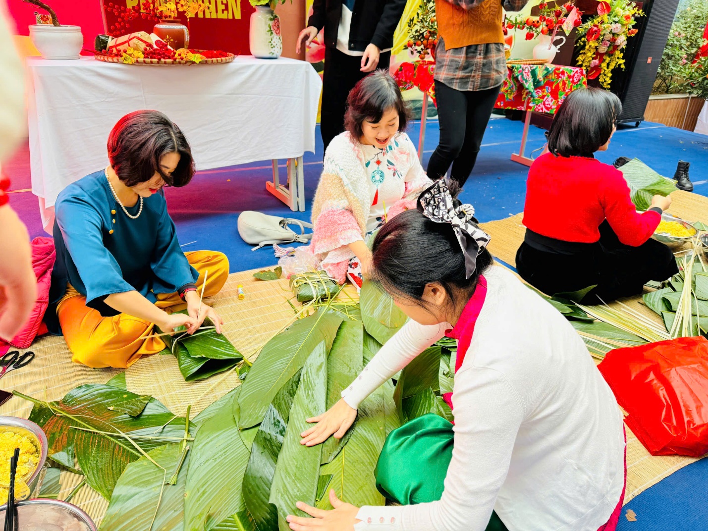 Hội thi đã thu hút các tổ chuyên môn tham gia hào hứng và tích cực. Trong không khí đầm ấm, ngay từ sáng sớm, các đội tham gia thi đã chủ động phân công nhiệm vụ cụ thể tới từng thành viên: người chuẩn bị lá dong, lạt; người chuẩn bị thực phẩm; người tham gia gói bánh… Sau khi tham gia gói từng chiếc bánh chưng với niềm yêu thương và gửi gắm những thông điệp xuân vào những chiếc bánh chưng xanh, các đội đã trình bày bàn cỗ với nhiều ý tưởng đẹp, phong phú, đậm đà văn hoá truyền thống Việt Nam. Ban Giám khảo đã đi từng bàn, chấm điểm bánh chưng theo tiêu chí: đúng kích thước, đủ số lượng, vuông thành, chắc tay, chấm phần bày biện trang trí trên mâm cỗ ngày Tết, thuyết trình thu hút và thuyết phục người nghe, chụp ảnh lưu niệm để làm tư liệu quý cho Công đoàn Nhà trường. Quả là một không khí thi đua vô cùng phấn khởi và có lẽ trong lòng mỗi đội tham gia thi đều cảm thấy vui vẻ, hào hứng.