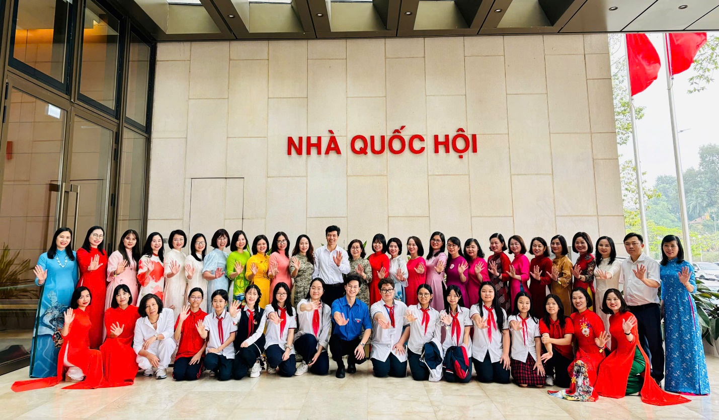 Thầy và trò nhà trường chụp ảnh lưu niệm tại Tòa nhà Quốc hội Việt Nam