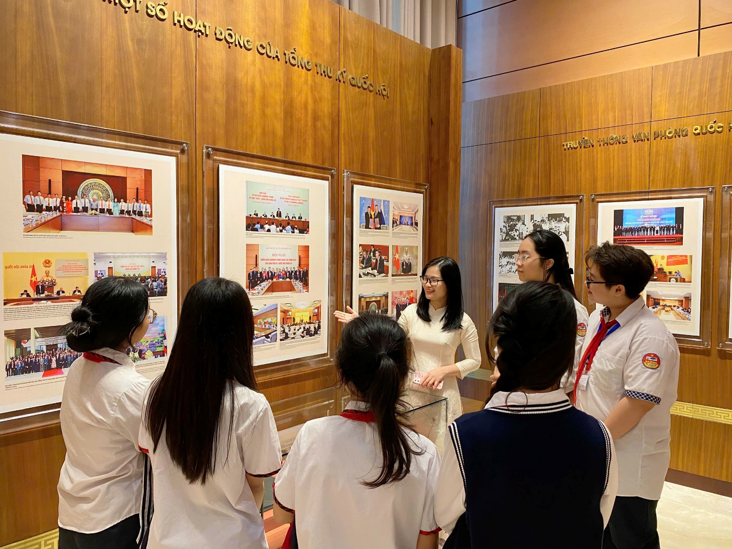 Bên cạnh đó, các em học sinh còn được hướng dẫn viên giới thiệu chi tiết mọi hiện vật được trưng bày tại phòng Truyền thống như: Mô hình của Tòa nhà Quốc hội; các bức ảnh Chủ tịch Hồ Chí Minh, Chủ tịch Quốc hội qua các nhiệm kỳ; các văn bản luật có tính lịch sử được Quốc hội ban hành; các hiện vật lịch sử khác và những hoạt động nổi bật của Quốc hội theo chiều dài của lịch sử và hiện tại.