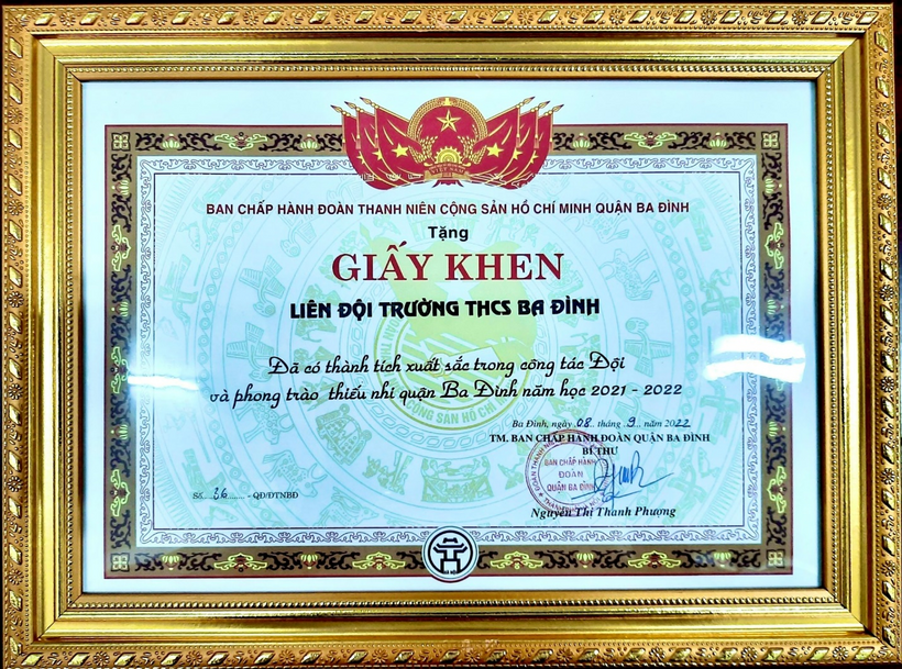 Trong năm học vừa qua, với sự quan tâm, chỉ đạo sát sao của Ban giám hiệu nhà trường, sự tâm huyết, nỗ lực của tất cả đội ngũ giáo viên chủ nhiệm và tập thể các chi đội, Liên đội trường THCS Ba Đình vinh dự được nhận giấy khen “Liên đội có thành tích xuất sắc trong công tác Đội và phong trào thi đua quận ba Đình năm học 2021 - 2022”.