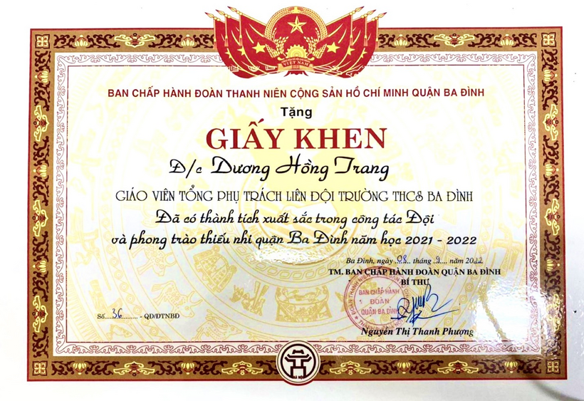 Với thành tích của phong trào Đội thiếu niên năm học 2021 - 2022, không thể không kể đến sự đóng góp nhiệt tình của cô giáo Dương Hồng Trang - Giáo viên Tổng phụ trách năm học 2021 - 2022. Bằng sự nhiệt tình cùng tài năng và sức trẻ, cô Dương Hồng Trang đã đồng hành cùng các phong trào và vinh dự được tặng giấy khen “Giáo viên Tổng phụ trách đã có thành tích xuất sắc trong công tác Đội và phong trào thiếu nhi quận Ba Đình năm học 2021 - 2022”.