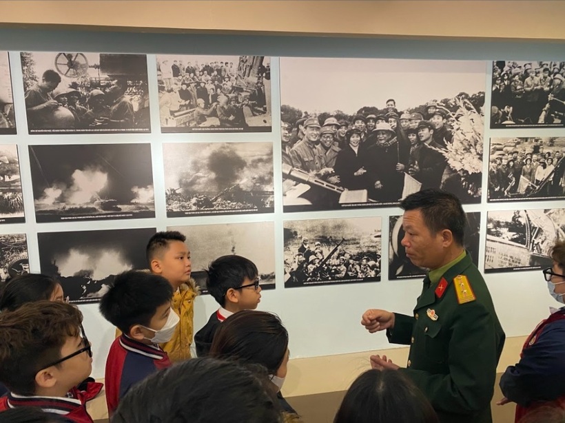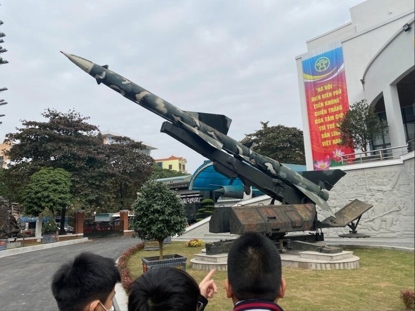 Các em được trải nghiệm khu trưng bày ngoài trời gồm có các loại vũ khí, khí tài của quân, dân Thủ đô Hà Nội; xác các máy bay B52 bị quân và dân Thủ đô bắn rơi trong 12 ngày đêm tháng 12/1972.