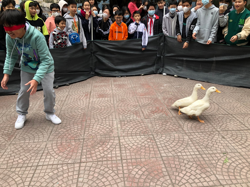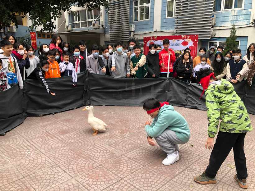 Trò chơi “Bắt vịt trên cạn” là trò chơi thu hút nhiều học sinh nhất. Trò chơi này thường được tổ chức nhân dịp hội hè hay lễ tết nào đó, cho cả người lớn và trẻ em đều được. Đây là lần đầu tiên, trò chơi vui nhộn, hấp dẫn này xuất hiện trong không gian lễ hội tại trường em. Nhìn các bạn bên ngoài cổ vũ, hướng dẫn cho bạn chơi có thể bắt được vịt thật thích. Những tiếng cười khoái chí hay tiếc nuối khi người chơi chạy lạc hướng hay vồ trượt đã đêm lại bầu khong khí vô cùng sôi động.