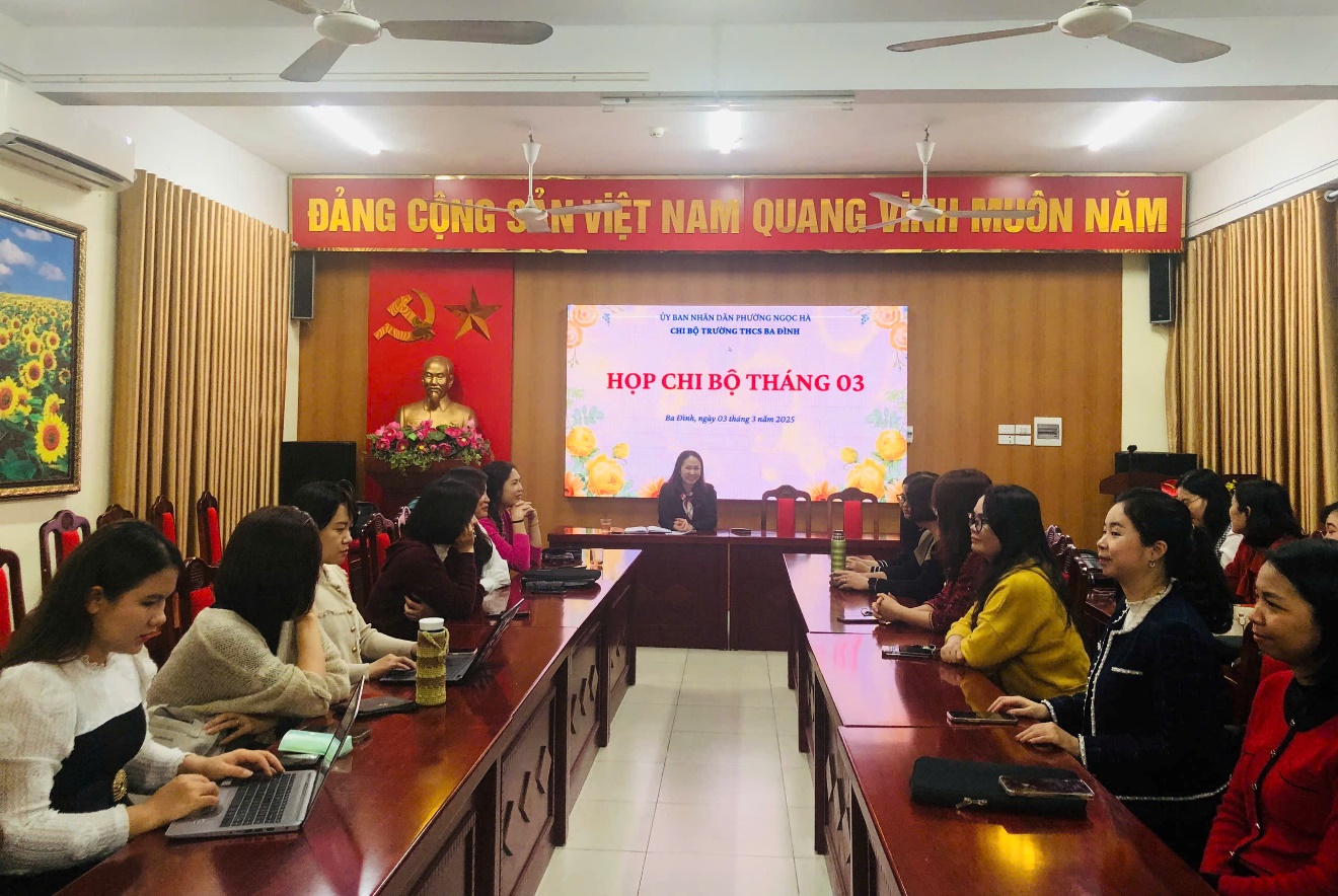 Chiều ngày 03/3/2025, tại trường THCS Ba Đình đã diễn ra cuộc họp Chi bộ tháng 3 với sự tham dự của các đồng chí Đảng viên trực thuộc Chi bộ nhà trường. Chủ trì cuộc họp là đồng chí Nguyễn Ngọc Dung - Đại diện cấp ủy Chi bộ, Phó Hiệu trưởng trường THCS Ba Đình.