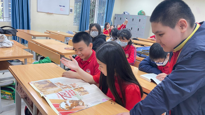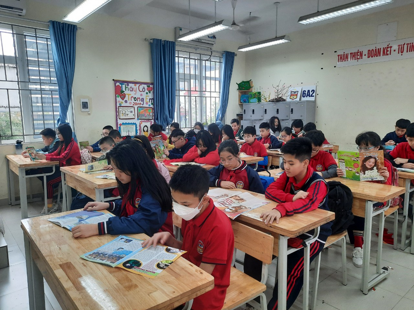 Học sinh đọc báo Thiếu niên tại lớp 6A2