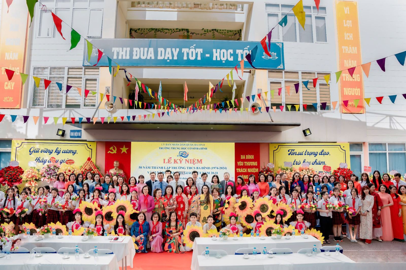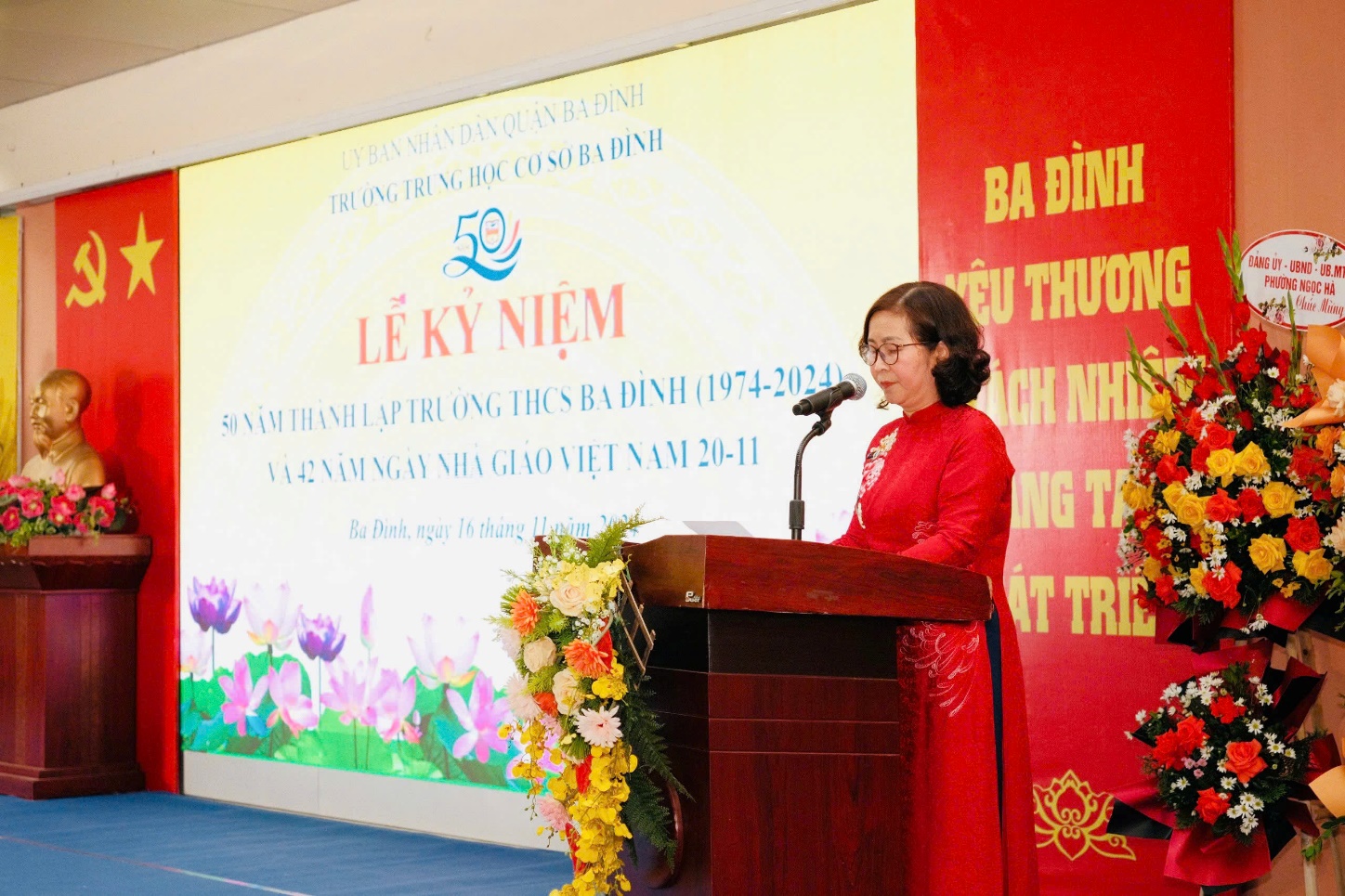 Tại buổi Lễ, nhà giáo Đặng Thị Ngọc Hường - Bí thư Chi bộ, Hiệu trưởng nhà trường trình bày diễn văn kỷ niệm 50 năm thành lập trường THCS Ba Đình với bao niềm tự hào. Trong bài phát biểu nhà giáo đã bày tỏ niềm tự hào sâu sắc: “Trong 50 năm qua, nhiều thế hệ thầy giáo, cô giáo đã đến và đi từ mái trường này, trong số đó có những thầy cô đã ra đi mãi mãi nhưng những hình ảnh thân thương, những kinh nghiệm giảng dạy quý báu, những tình cảm ấp áp của họ vẫn còn in dấu nơi đây trong những trang giáo án của nhiều lớp giáo viên trẻ, hay dẫn lối thành công cho biết bao thế hệ học trò.”