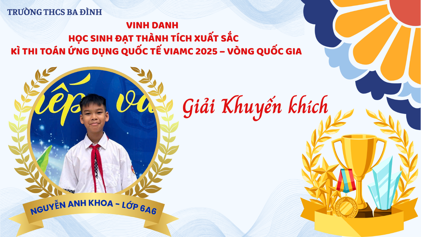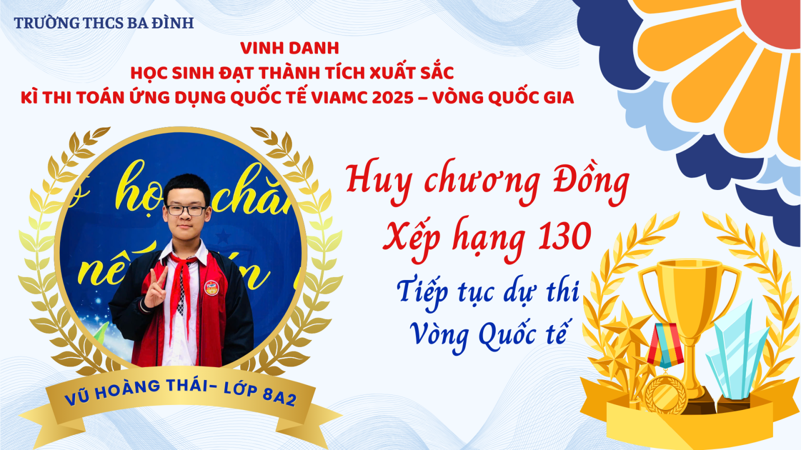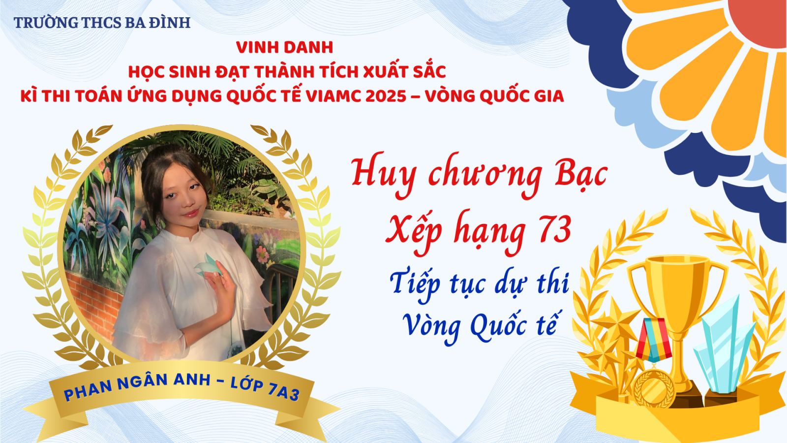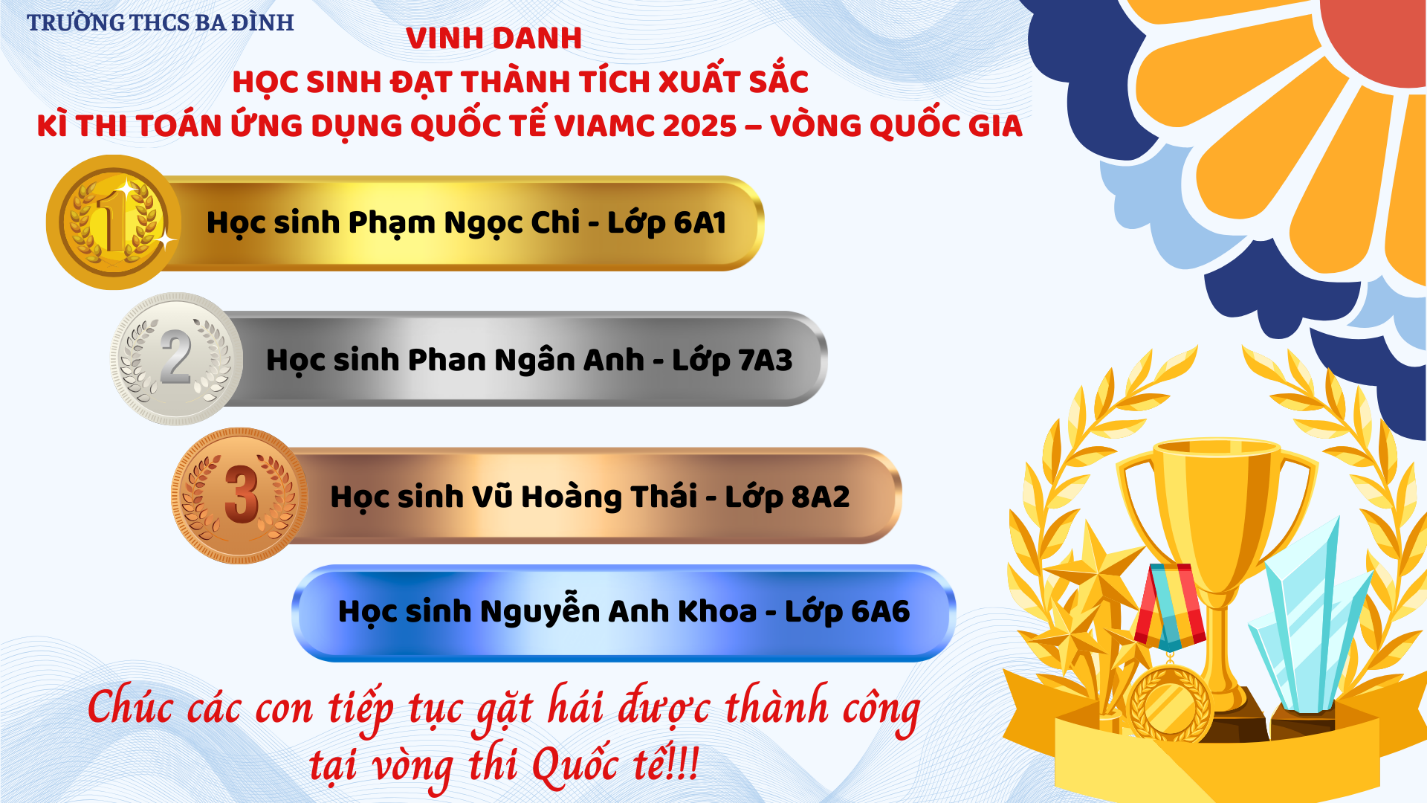 Tham gia sân chơi trí tuệ thử thách này, học sinh Trường THCS Ba Đình đã ghi dấu ấn mạnh bằng những thành tích ấn tượng. Trong số 9 học sinh dự thi vòng Quốc gia, 4 học sinh đạt thành tích xuất sắc với 01 tấm huy chương Vàng, 01 huy chương Bạc, 01 huy chương Đồng và 01 giải Khuyến khích. Với kết quả này, 03 học sinh của nhà trường sẽ tiếp tục bước vào Vòng thi Quốc tế tổ chức vào tháng 6/2025 tổ chức tại Thành phố Đà Nẵng xinh đẹp.