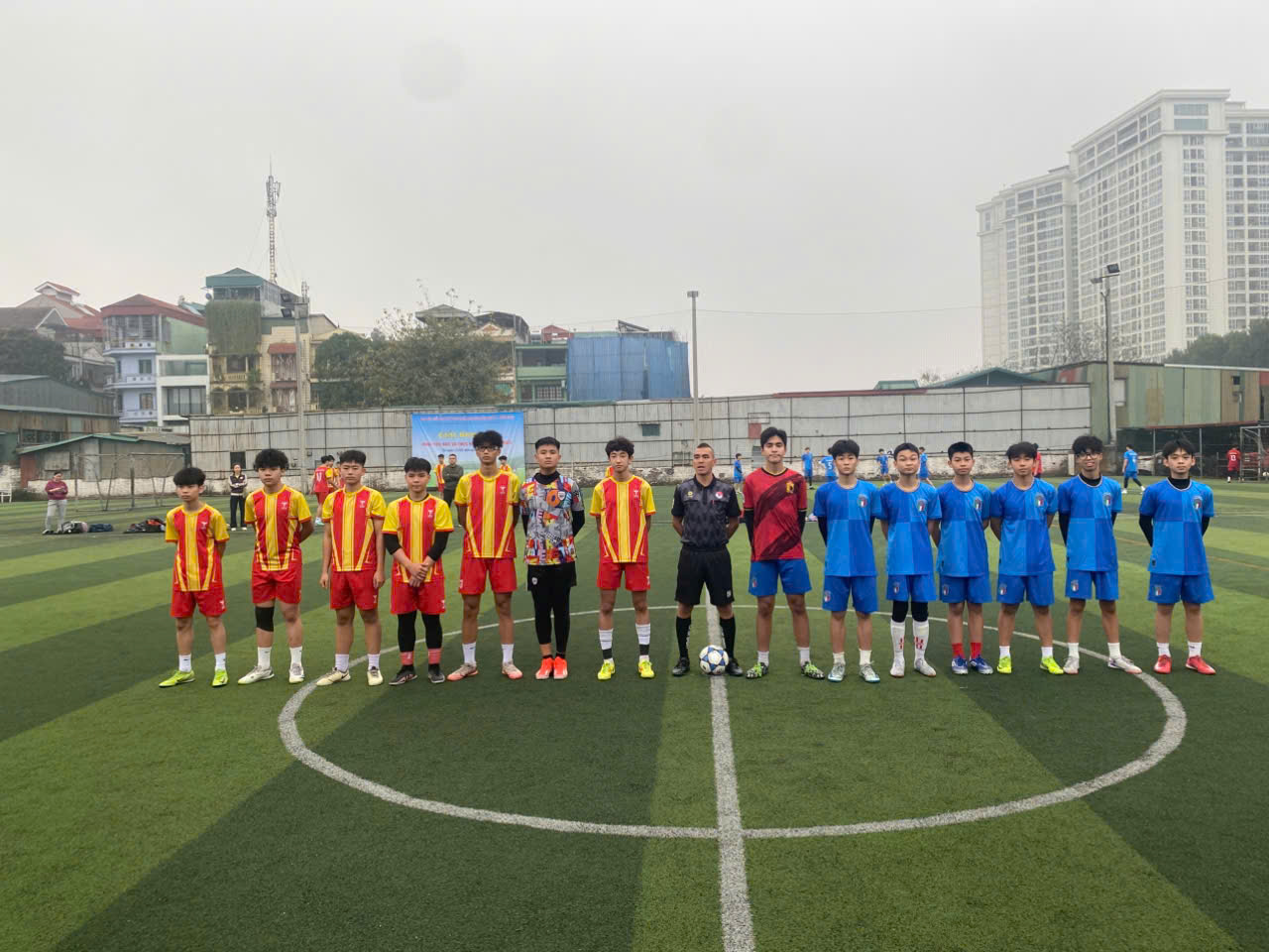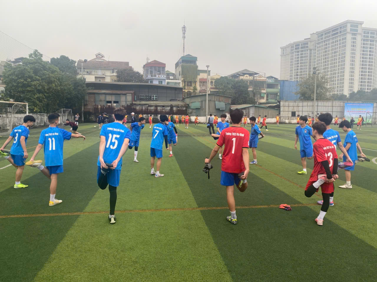 Các cầu thủ khởi động kỹ trước khi vào trận đấu với THCS Giảng Võ 2