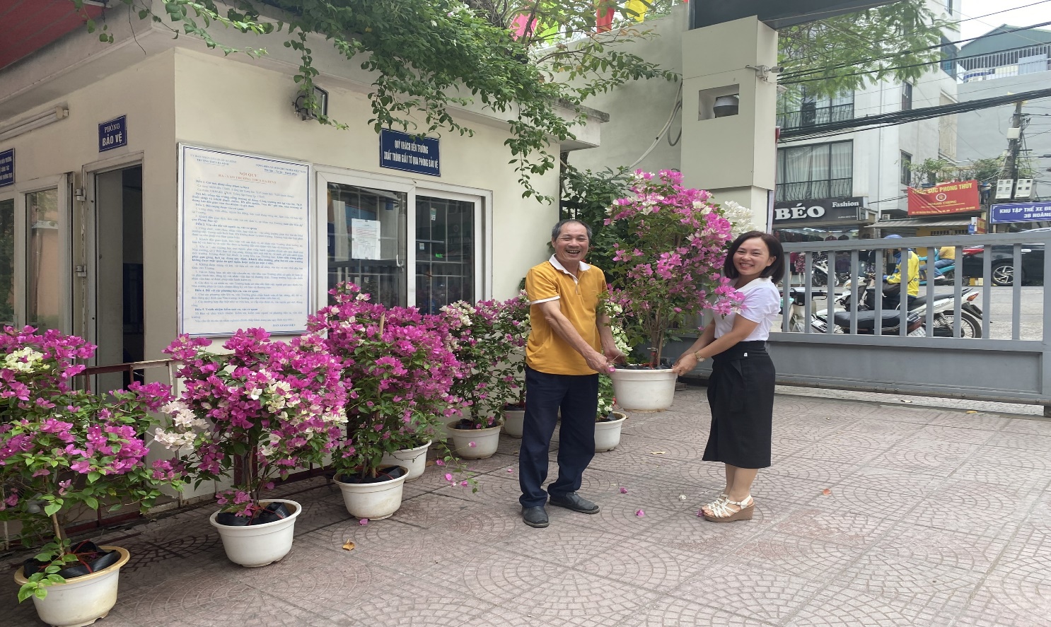 Cô Loan kế toán rạng rỡ bên những chậu hoa sắc màu rực rỡ