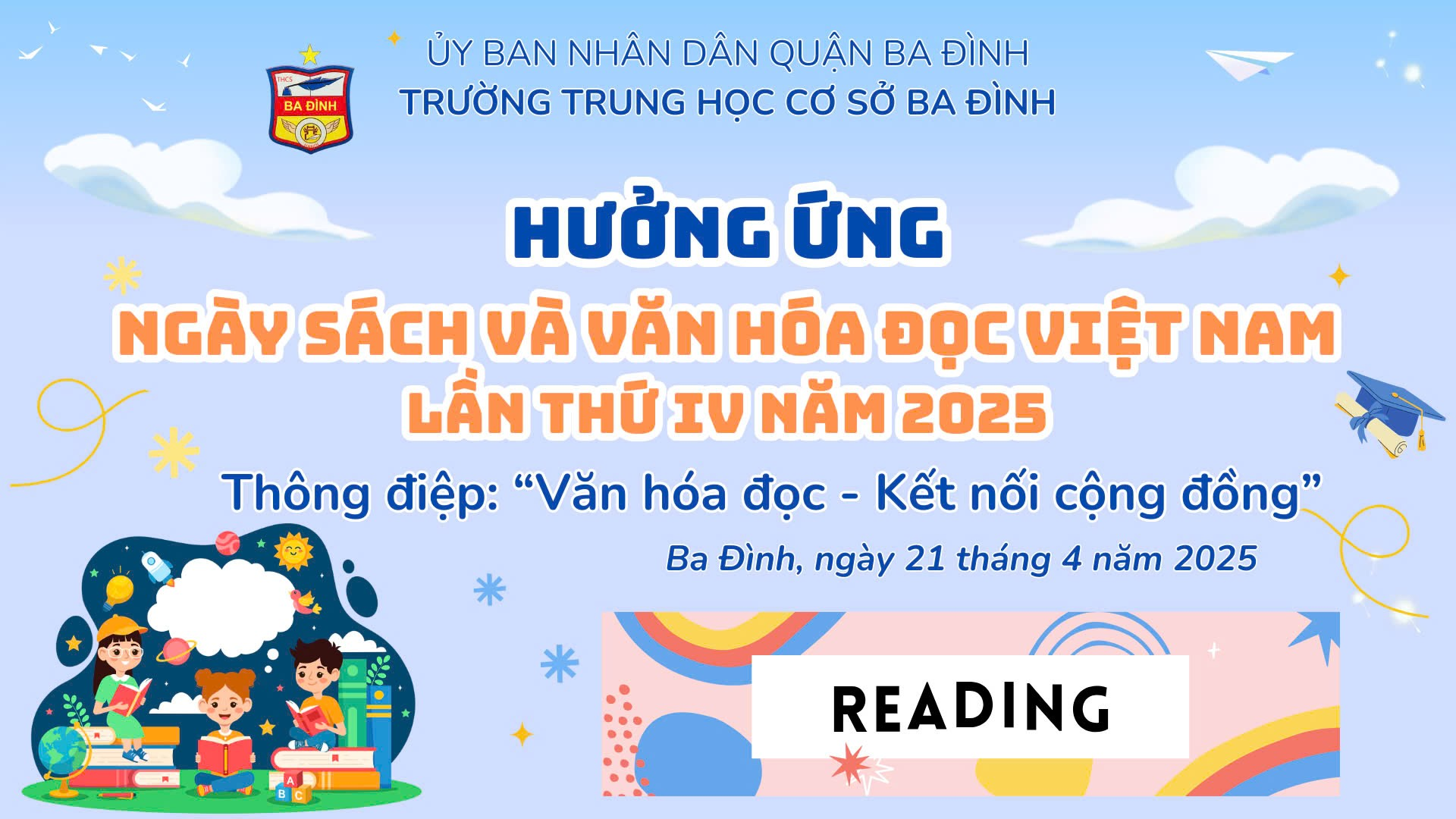 Chủ đề Ngày Sách và Văn hóa đọc 2025 tại trường THCS Ba Đình "Văn hóa đọc - Kết nối cộng đồng" không chỉ đơn thuần là một thông điệp mà còn thể hiện một mục tiêu sâu sắc: thúc đẩy thói quen đọc sách và tạo sự gắn kết giữa các thế hệ, cộng đồng thông qua tri thức. Mỗi trang sách được lật mở, mỗi cuốn sách được trao đi, sẽ có thêm một tâm hồn được truyền cảm hứng, một trí tuệ được đánh thức, và một hành trình khám phá mới bắt đầu.