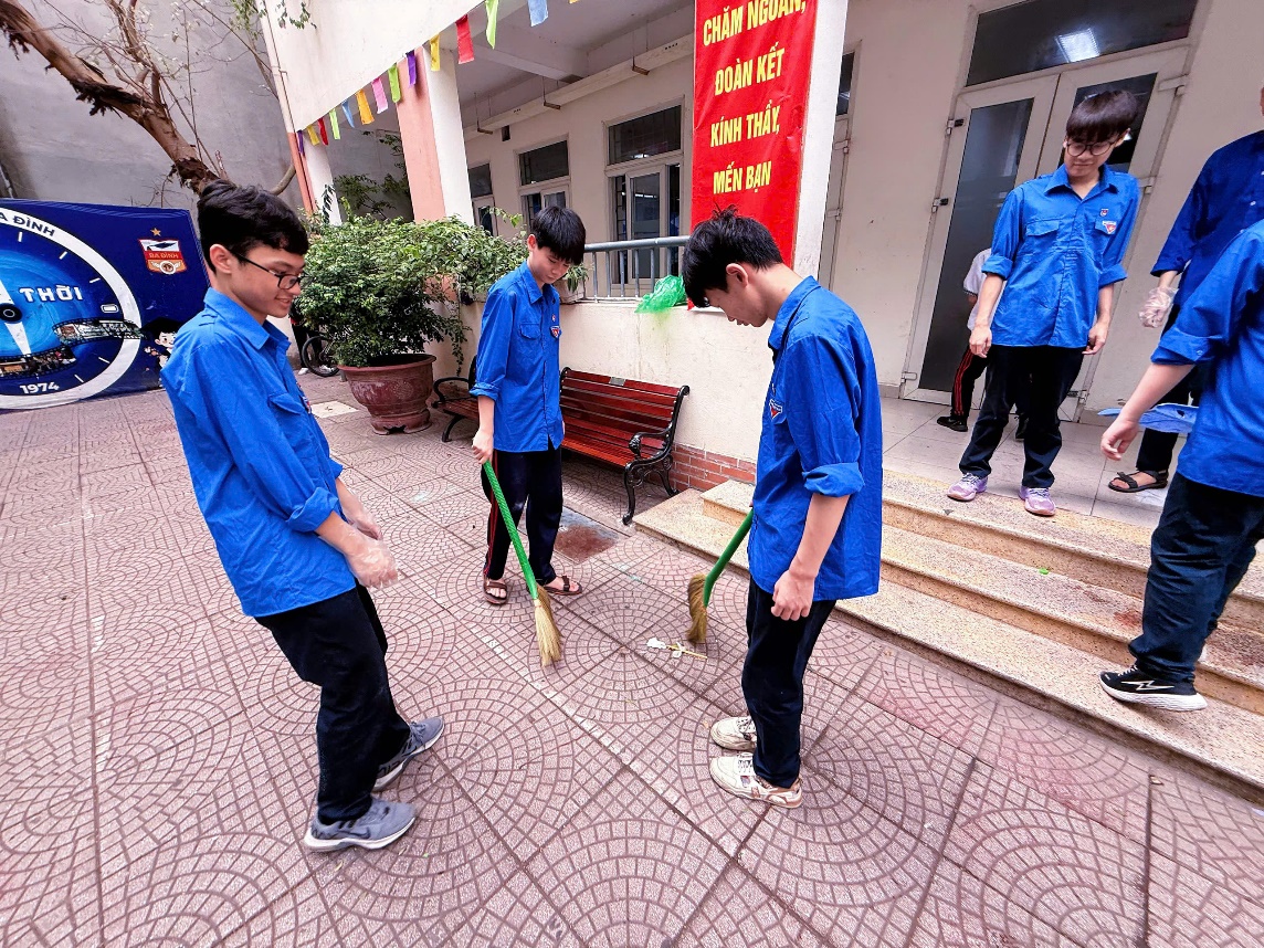 Các đoàn viên thanh niên hăng hái quét dọn, giữ gìn vệ sinh sân trường luôn sạch đẹp