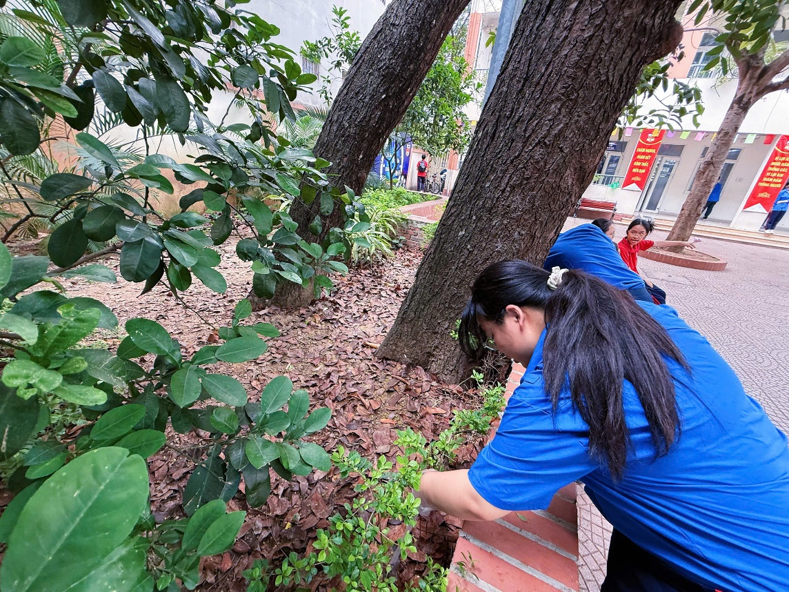Đoàn viên trường THCS Ba Đình tích cực làm cỏ, dọn dẹp bồn cây