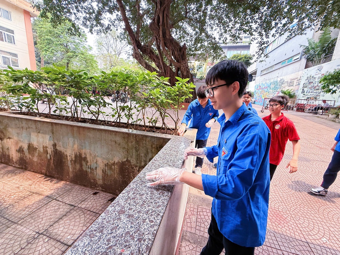 Đoàn viên trường THCS Ba Đình tích cực dọn vệ sinh, thu gom rác tại khu vực sân trường