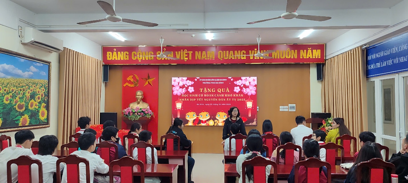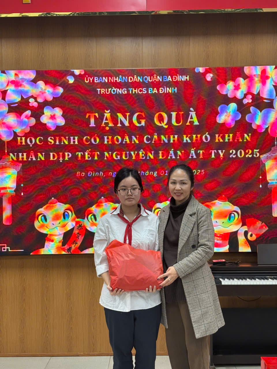 Năm nào cũng vậy, cứ mỗi độ Xuân về, hoa Đào, hoa Mai nở rộ, cũng là lúc thầy và trò trường THCS Ba Đình lại háo hức chuẩn bị Lễ hội chào Xuân. Các em học sinh sẽ được trải nghiệm những trò chơi dân gian, mặc những trang phục rực rỡ sắc màu của các dân tộc Việt Nam trong ngày hội. Nằm trong chuỗi các hoạt động này, nhà trường vẫn luôn quan tâm chăm lo chu đáo cho các em học sinh có hoàn cảnh khó khăn với nhiều hình thức khác nhau. Ngày 22/01/2025, Ban giám hiệu nhà trường phối hợp với Công đoàn, Liên đội cùng Hội chữ thập đỏ nhà trường đã trao tặng 41 suất quà cho 41 em học sinh có hoàn cảnh khó khăn đến từ các khối 6, 7, 8, 9 trong nhà trường.
