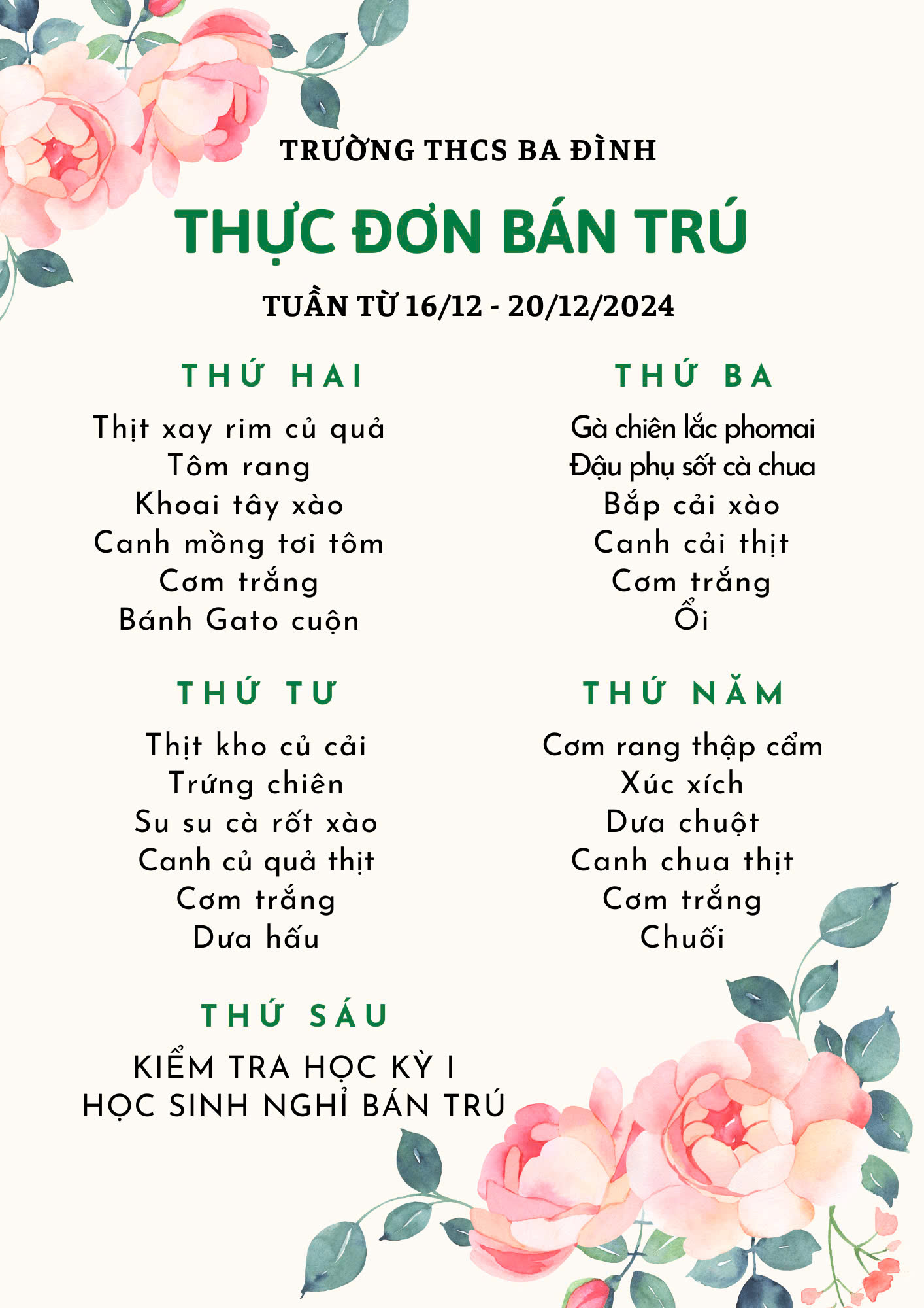 Thực đơn bán trú trường THCS Ba Đình tuần từ ngày 16/12/2024 đến ngày 20/12/2024
