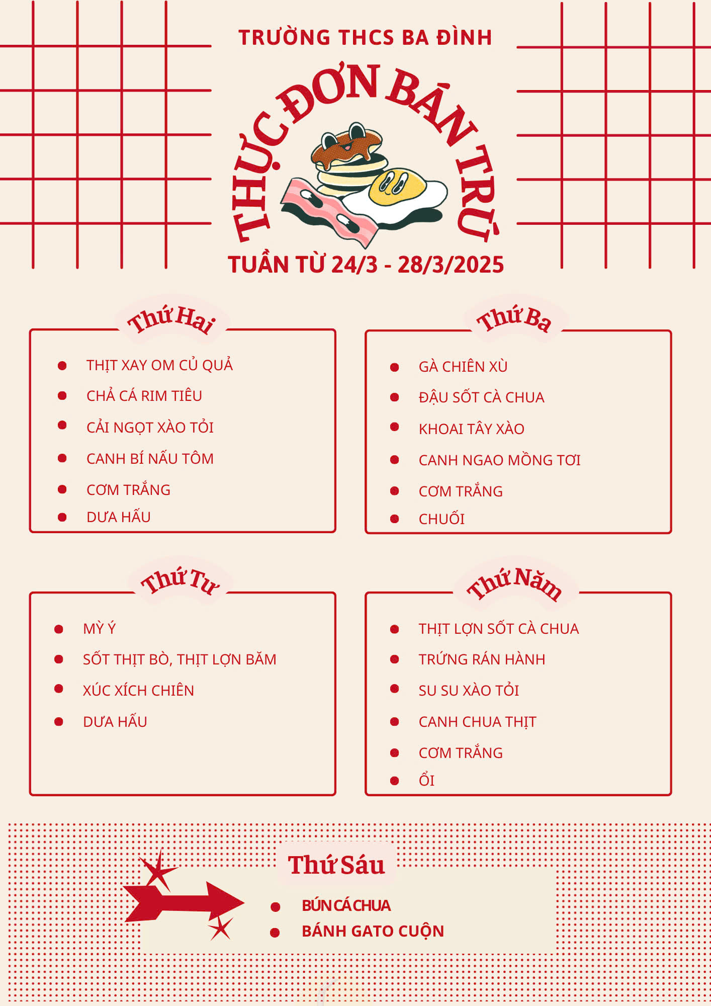 Thực đơn bán trú trường THCS Ba Đình tuần từ ngày 24/3/2025 đến ngày 28/3/2025