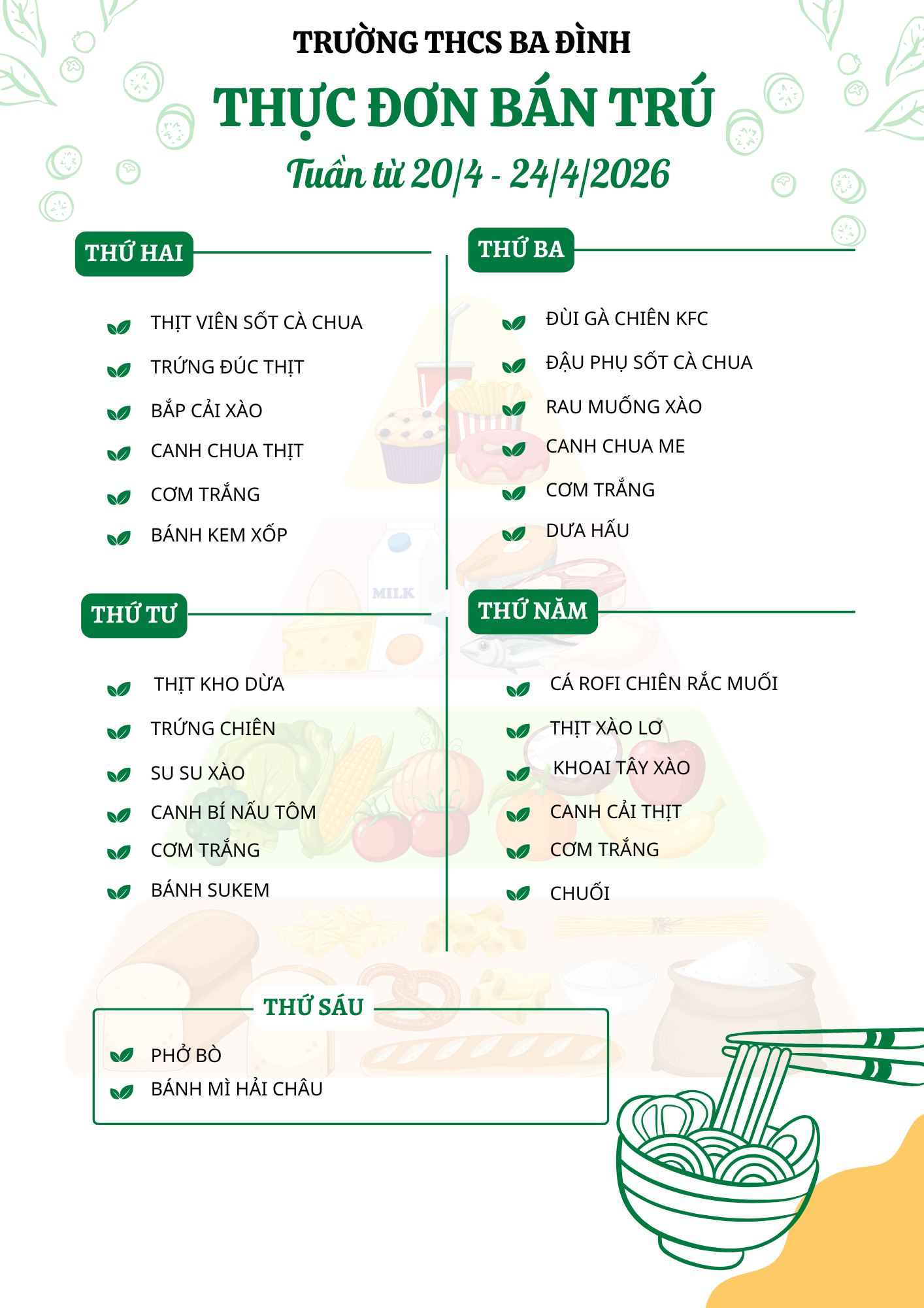 Thực đơn bán trú tuần từ 20/4 đến hết ngày 24/4/2026