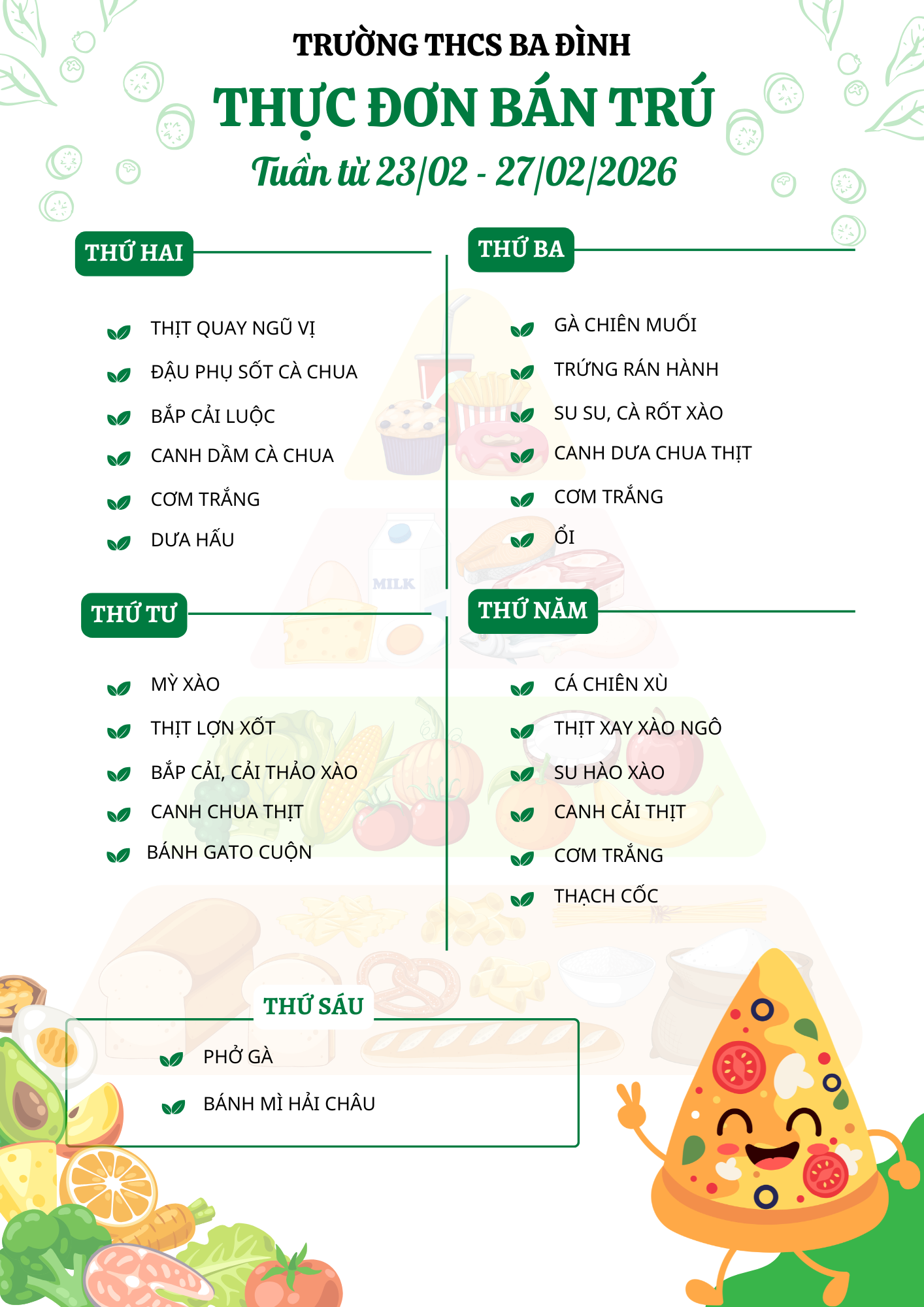 Thực đơn bán trú tuần từ 23/02 đến hết ngày 27/02/2026
