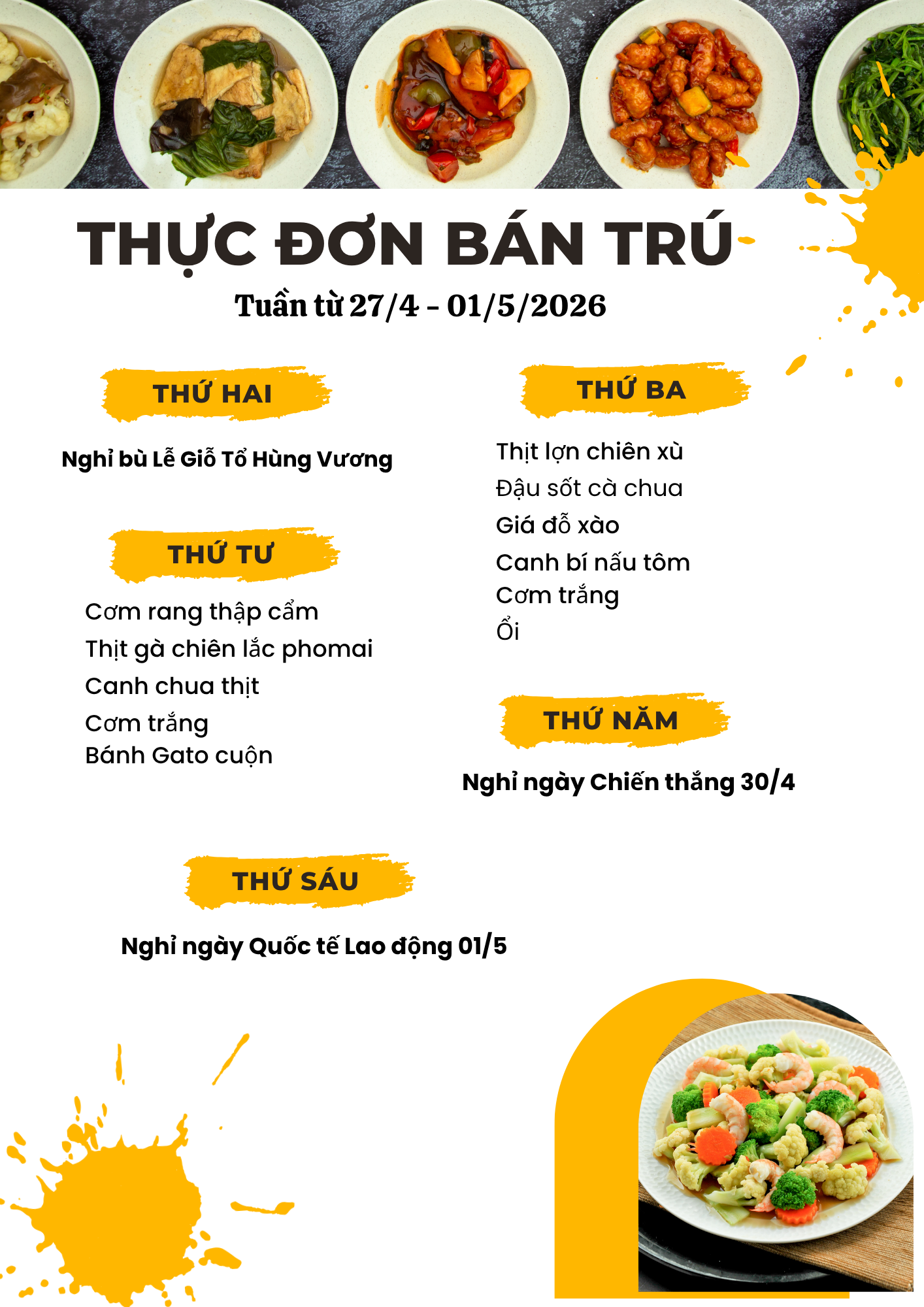 Thực đơn bán trú tuần từ 27/4 đến hết ngày 01/5/2026