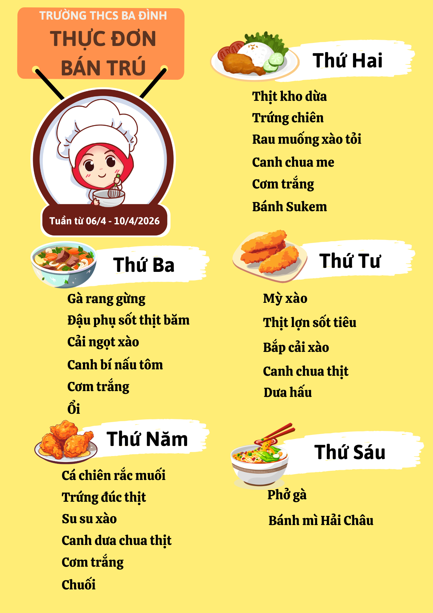 Thực đơn bán trú tuần từ ngày 06/4 đến hết ngày 10/4/2026