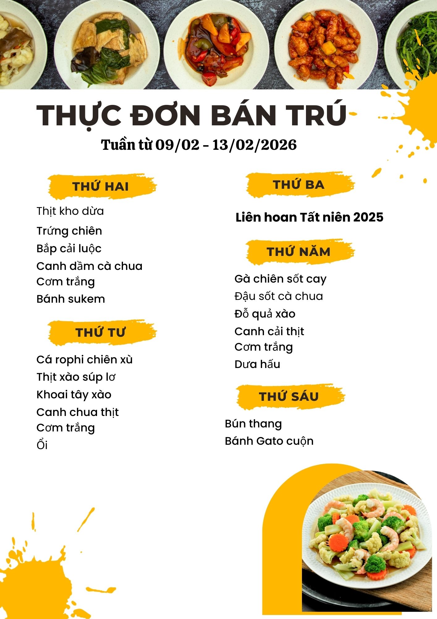 Thực đơn bán trú tuần từ 02/02 đến hết ngày 06/02/2026