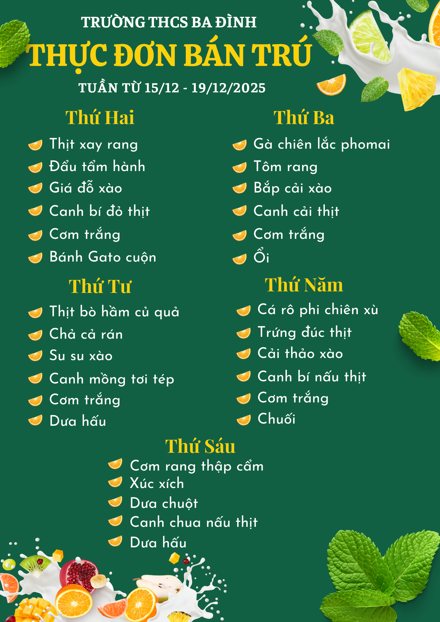 Thực đơn bán trú tuần từ ngày 15/12 đến hết ngày 19/12/2025