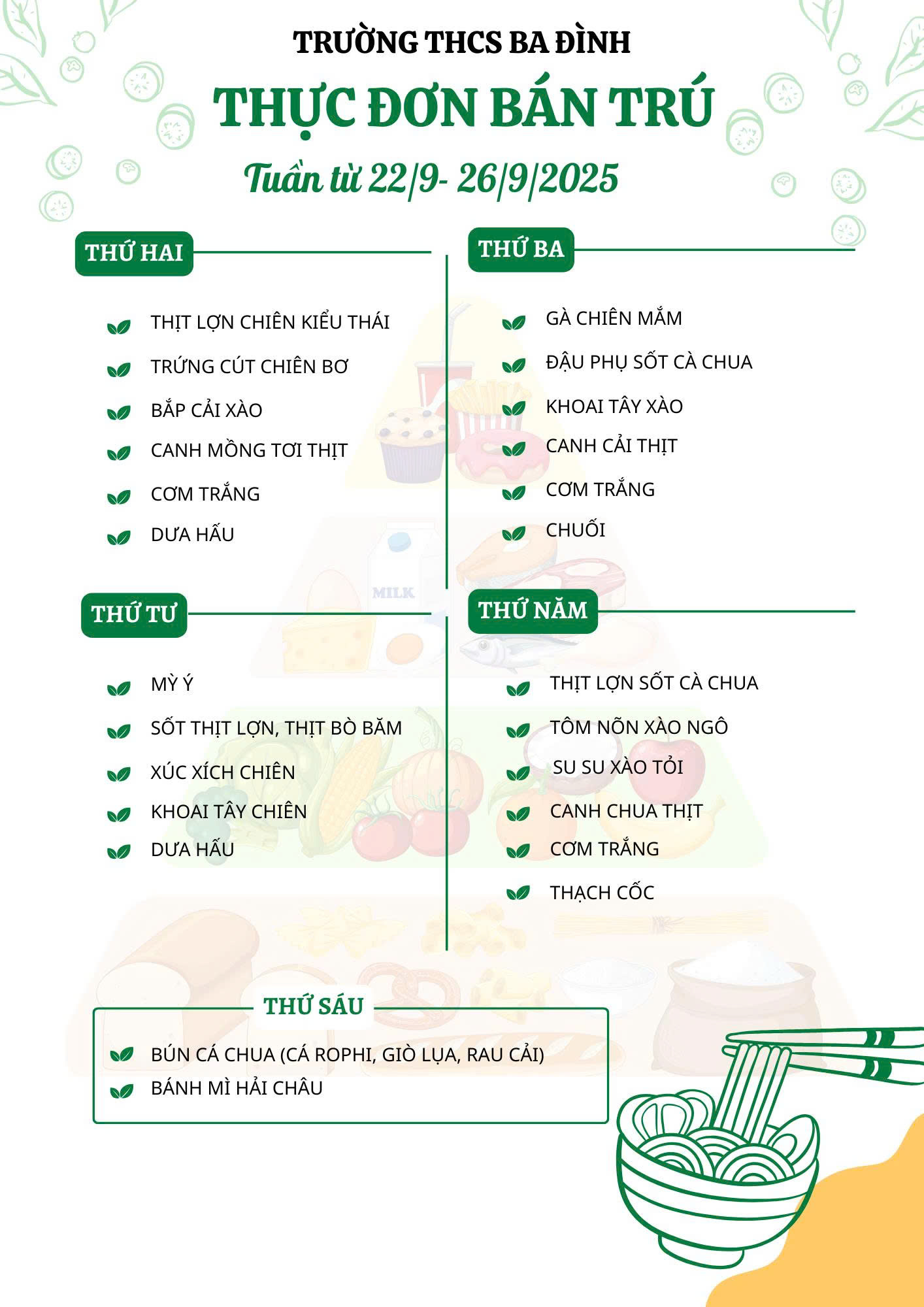 Thực đơn bán trú tuần từ ngày 22/9/2025 đến hết ngày 26/9/2025