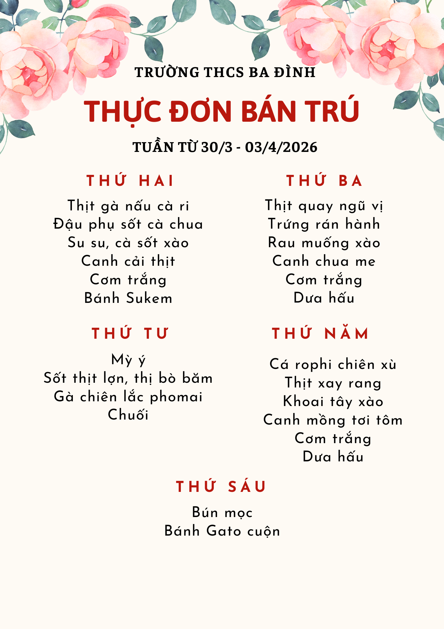 Thực đơn bán trú tuần từ ngày 30/3 đến hết ngày 03/4/2026