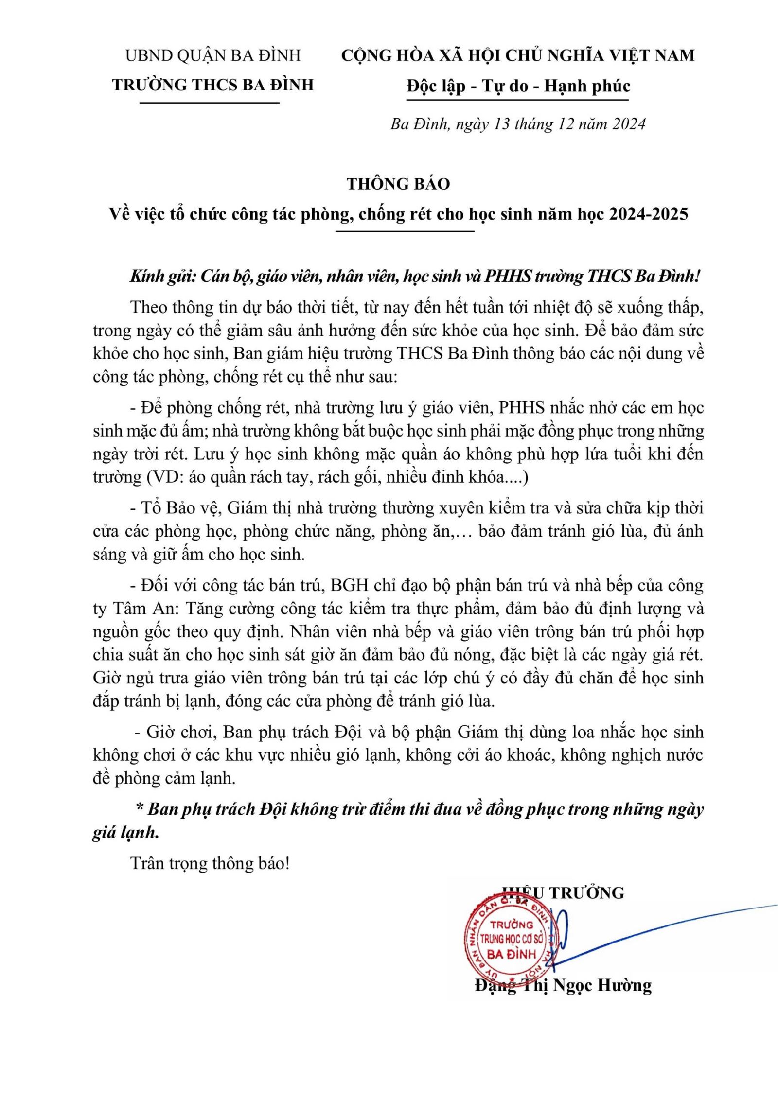 Trường THCS Ba Đình thông báo về việc tổ chức công tác phòng, chống rét cho học sinh năm học 2024-2025