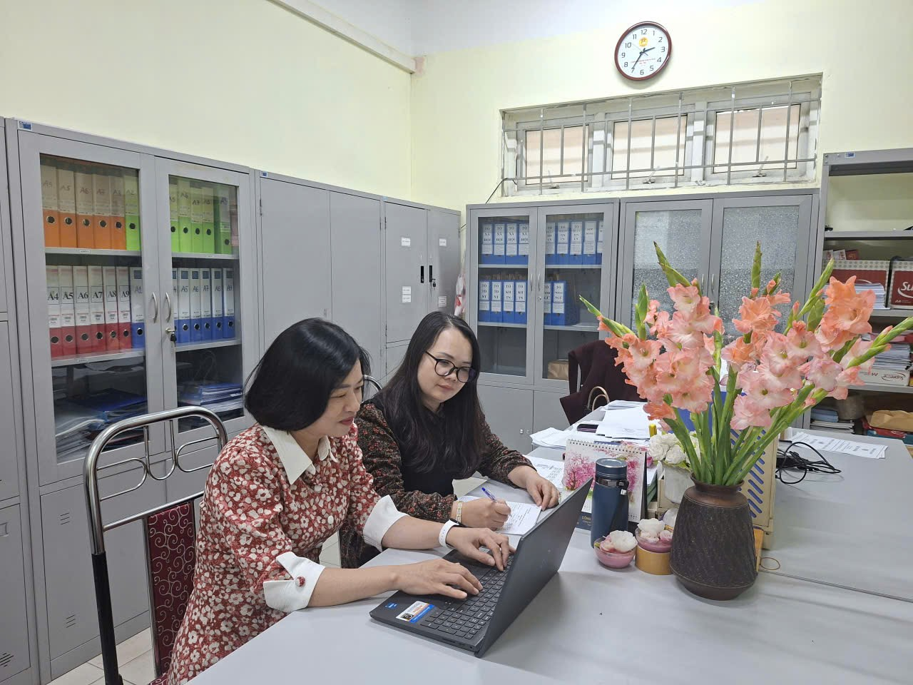 Đ/c Đào Thủy và Thu Trang - Đảng viên Chi bộ trường THCS Ba Đình đang cùng nhau làm bài thi trực tuyến