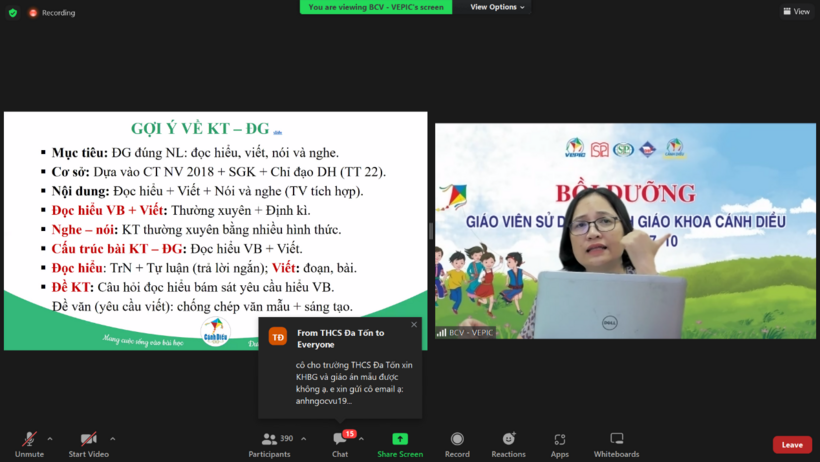 Sáng ngày 14/7, tại hội nghị bồi dưỡng giáo viên sử dụng sách giáo khoa cánh diều, PGS.TS Đỗ Ngọc Thống đã trao đổi nhiều nội dung quan trọng về sự khác biệt của chương trình 2018 và chương trình 2006, cấu trúc sách giáo khoa Ngữ văn 7 và phương pháp dạy học. Buổi chiều cùng ngày, TS. Phạm Thị Thu Hiền cũng phân tích cụ thể bài dạy minh họa, hướng dẫn xây dựng khung phân phối chương trình và cách kiểm tra đánh giá cho các giáo viên.