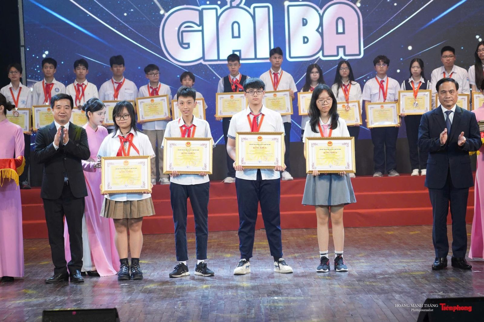Các em Trần Hiểu Minh - lớp 9A8 và Trần Vũ Hải - lớp 8A7 (đứng ở giữa) nhận Bằng khen và huy chương Đồng tại Lễ trao giải